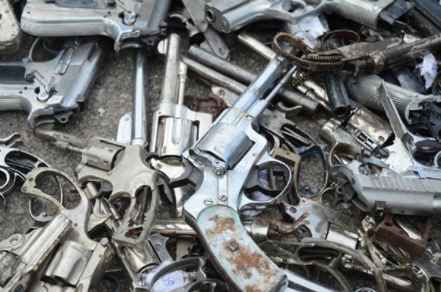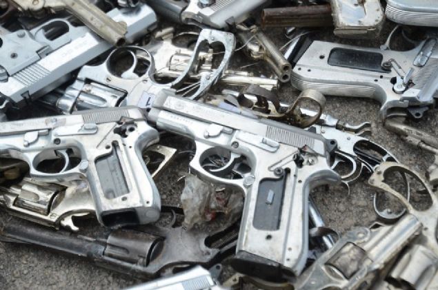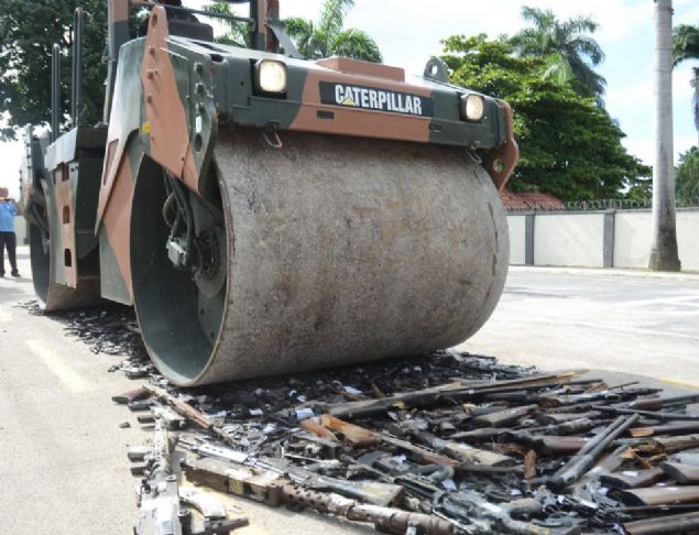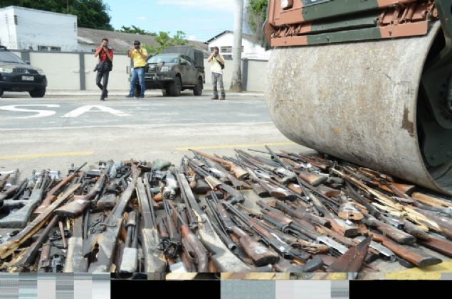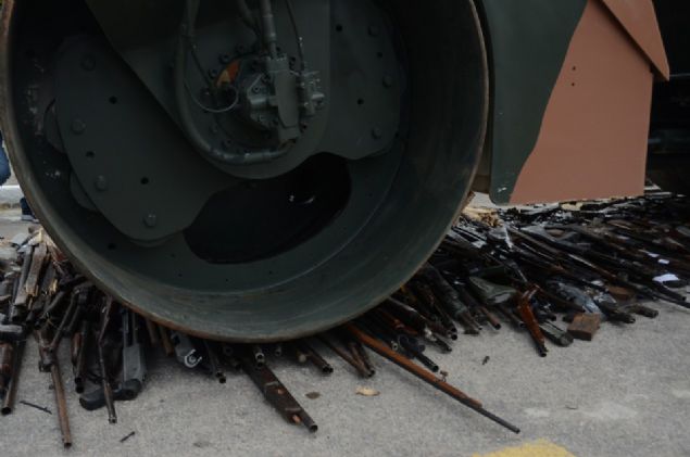 Tabancadan tüfeğe, otomatik silahdan ağır makineliye kadar çok farklı sınıftaki silah, kentteki bir askeri birlikte önce yola serildi, ardından da medya mensuplarının önünde silindirle ezildi.