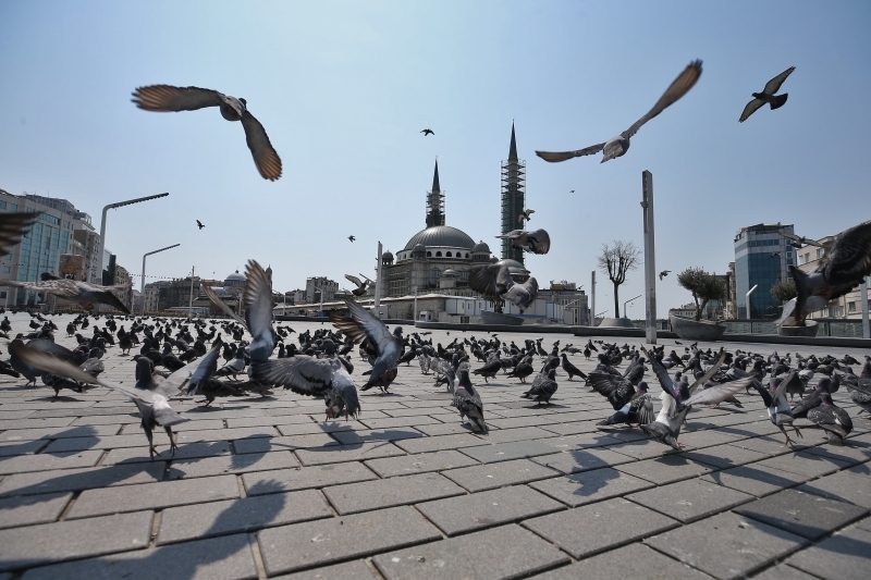 Ankara'da yeni tip koronavirüsle (Covid-19) mücadele kapsamında sokağa çıkma yasağının başlamasının ardından cadde ve sokaklarının boş kalmasıyla yiyecek bulamayan güvercinlere polis ekipleri yem verdi.