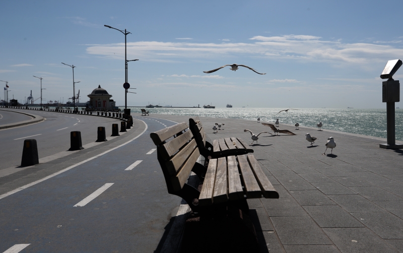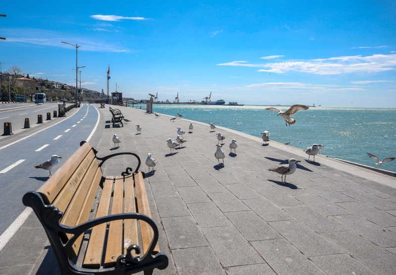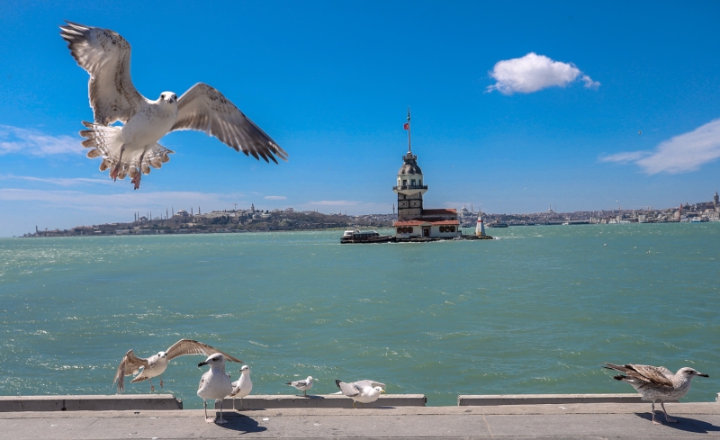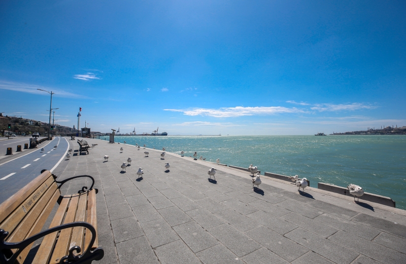 İnsanların yokluğunda sahildeki kaldırımlara konan martılar, Kız Kulesi ve Tarihi Yarımada ile güzel görüntü oluşturdu.