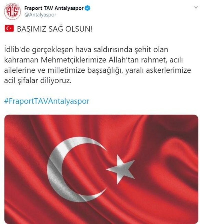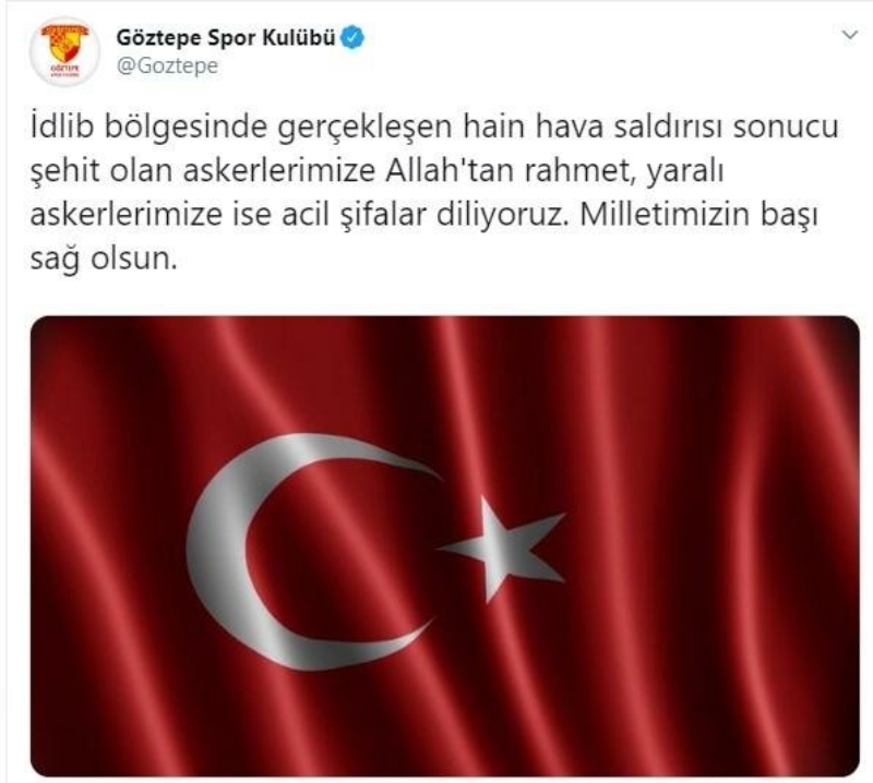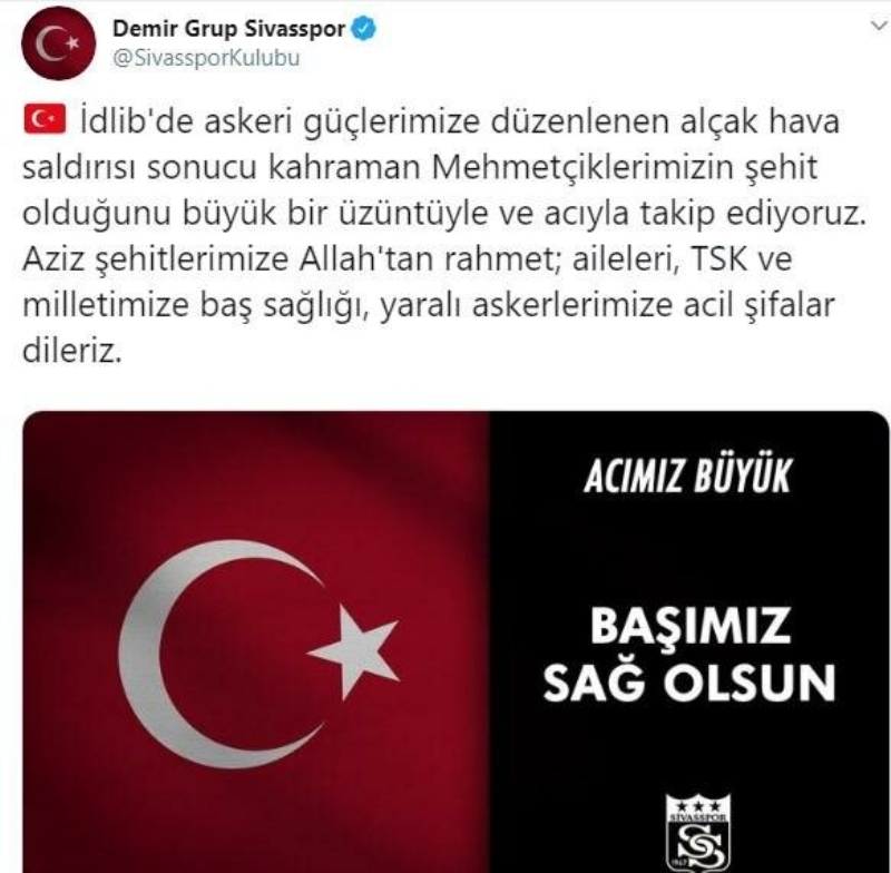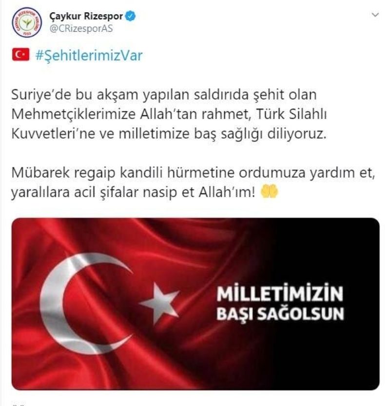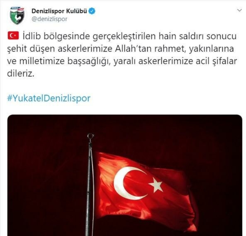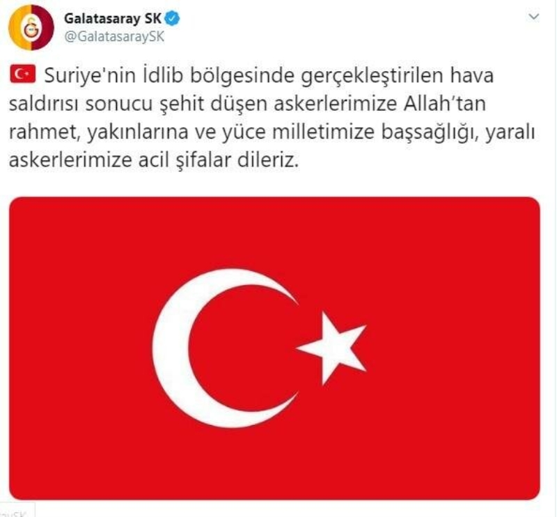 Suriye'nin İdlib şehrine rejim güçleri tarafından düzenlenen menfur saldırı sonrası 33 Mehmetçiğimizin şehit düşmesi sonrası Türk spor kulüplerinden de mesajlar geldi.