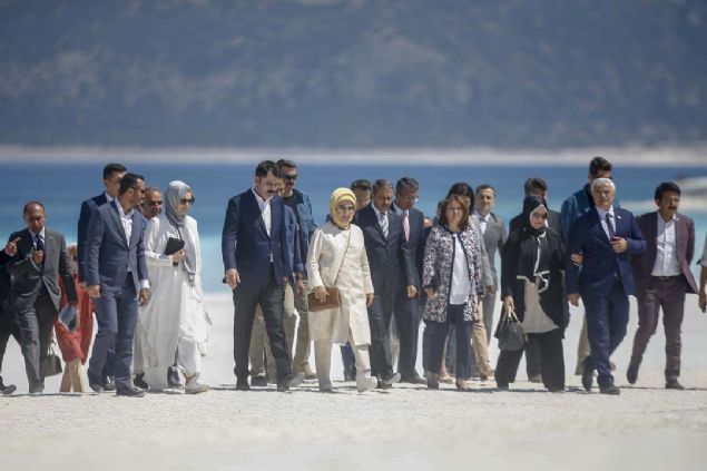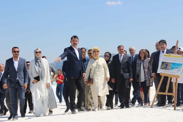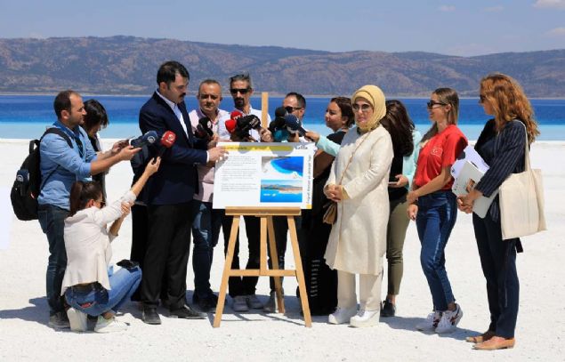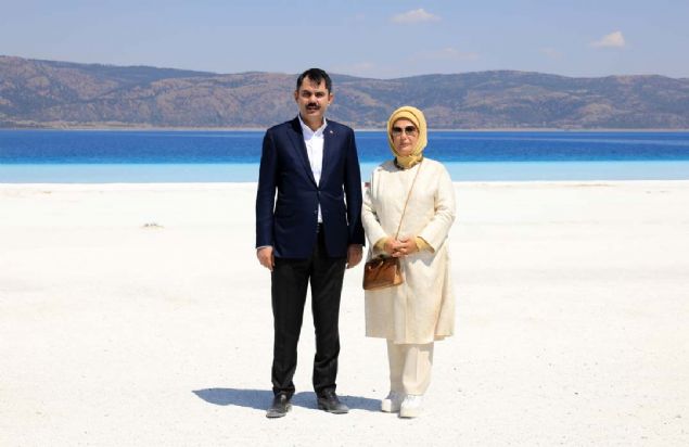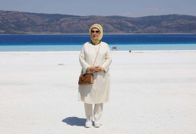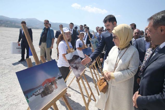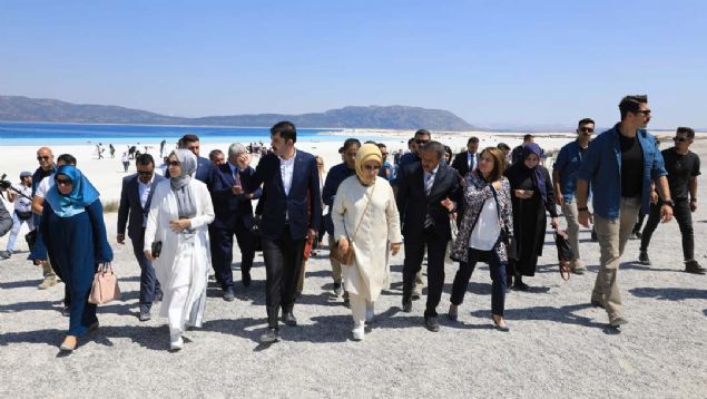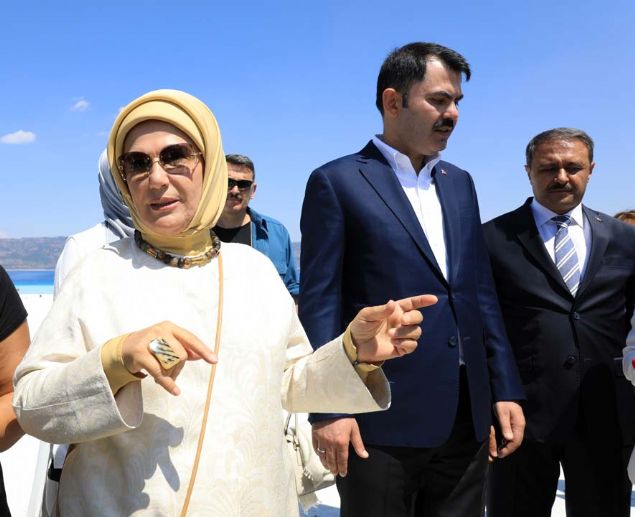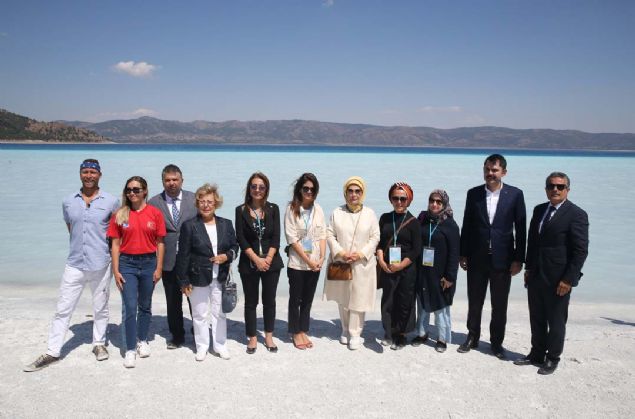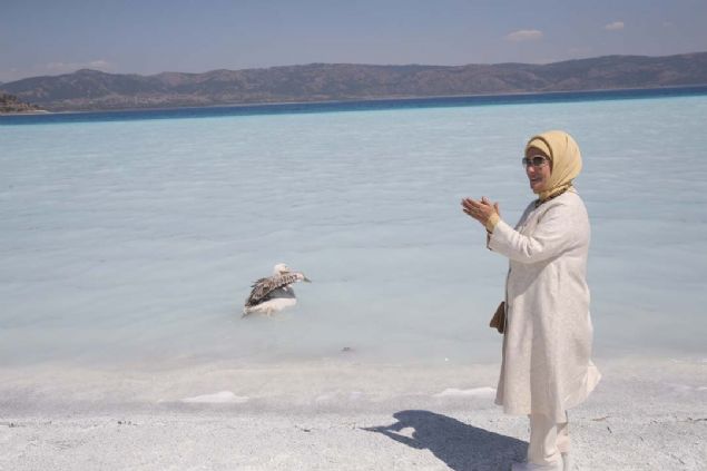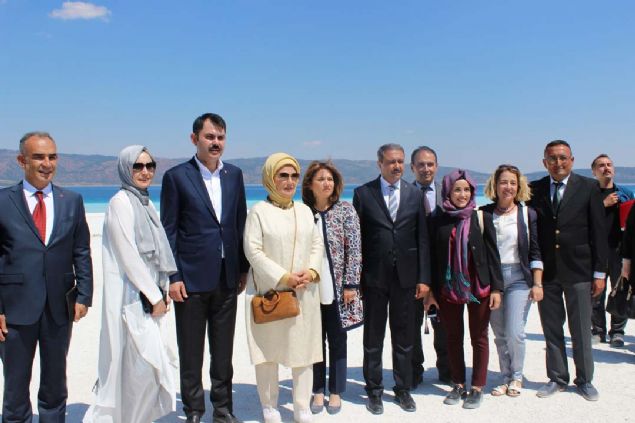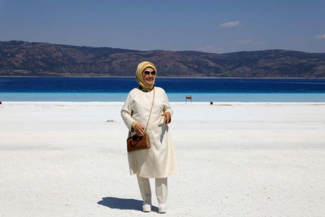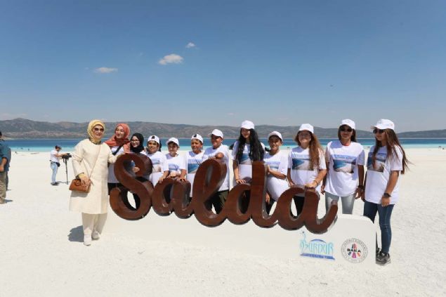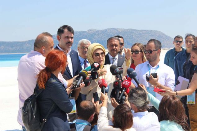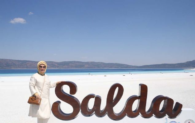 Burdur'da beyaz kumsalları ve turkuaz rengi nedeniyle 'Türkiye'nin Maldivleri' olarak ünlenen Salda Gölü'nü gezen ve yapılan çalışmalar hakkında bilgi alan Cumhurbaşkanı Recep Tayyip Erdoğan'ın eşi Emine Erdoğan, 'Gerçekten görünce mutmain oldum. Bütün halkımızın da mutmain olmasını tavsiye ediyorum. O halden bu hale gelişi, gerçekten çok güzel bir girişim. Bakanlığımızı tebrik ediyorum.' dedi.