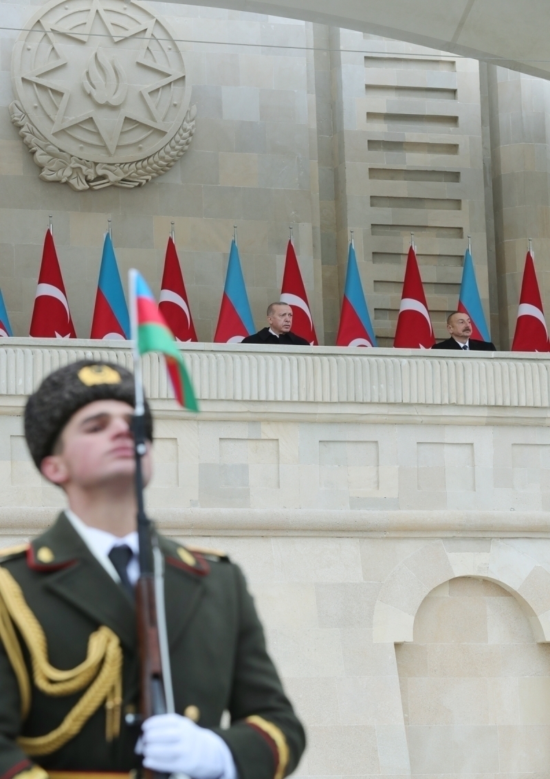 Erdoğan ve Aliyev, aynı anda 'Selam asker' diyerek alandaki birlikleri selamladı, sonra eşleri ve birlikte kendilerine ayrılan yerde töreni izledi.