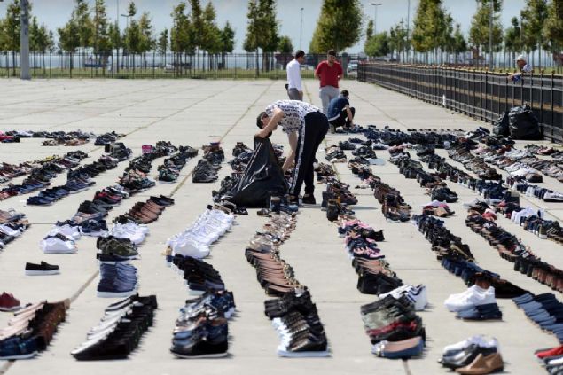 Eminönü Yeraltı Çarşısı'nda şiddetli yağışla sular altında kalan ayakkabılar Yenikapı miting alanına serilerek kurumaya bırakıldı.