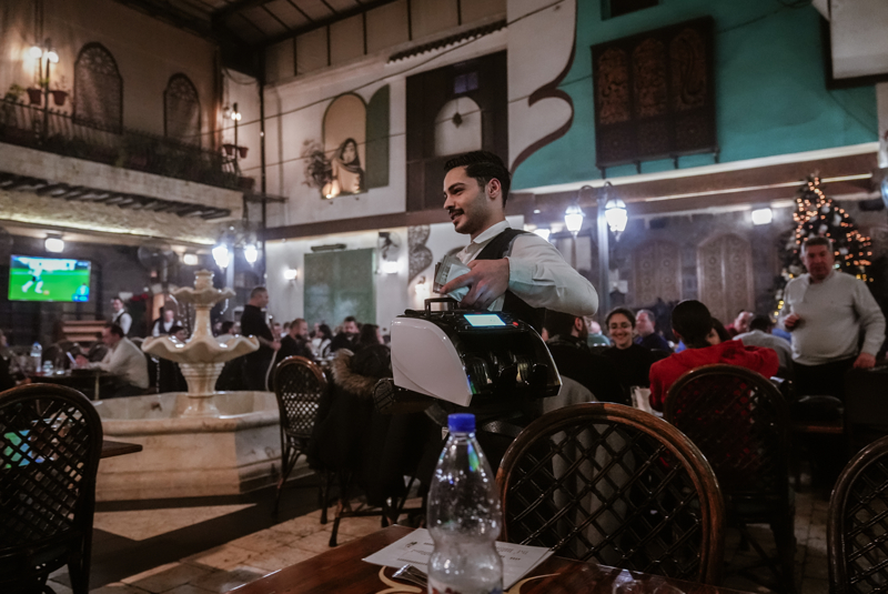 Türkiye'de kredi ve banka kartının yaygınlaşmasının ardından masalara hesap ödemek için gelen pos cihazlarının aksine Suriye'de bir işletmede hesap ödenirken masaya para sayma makinesi geliyor.