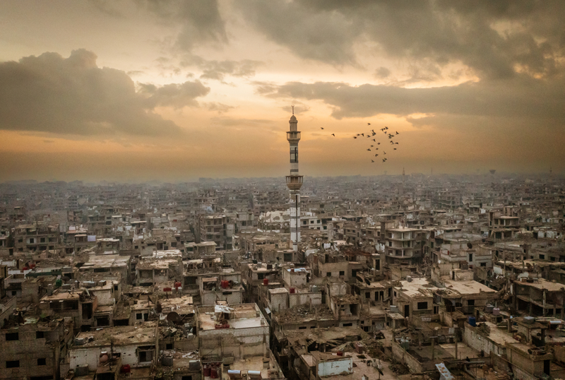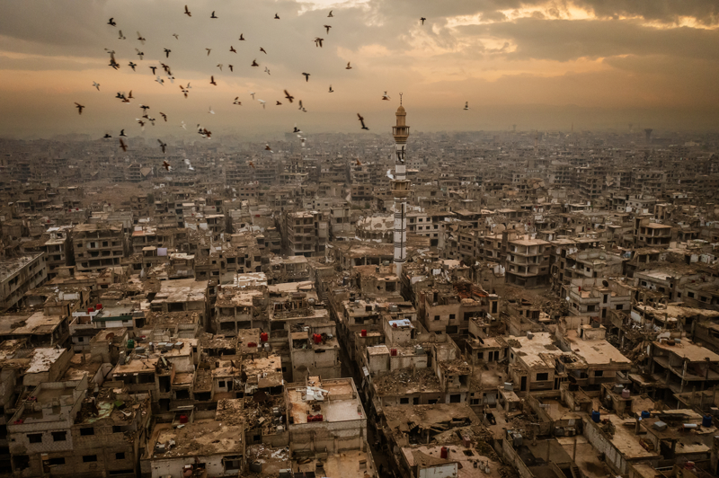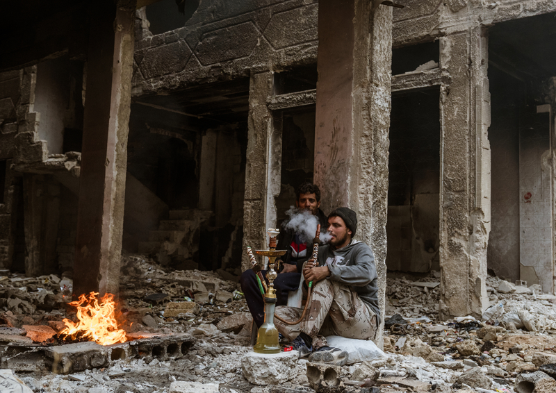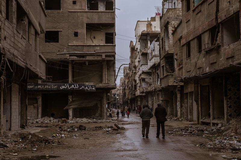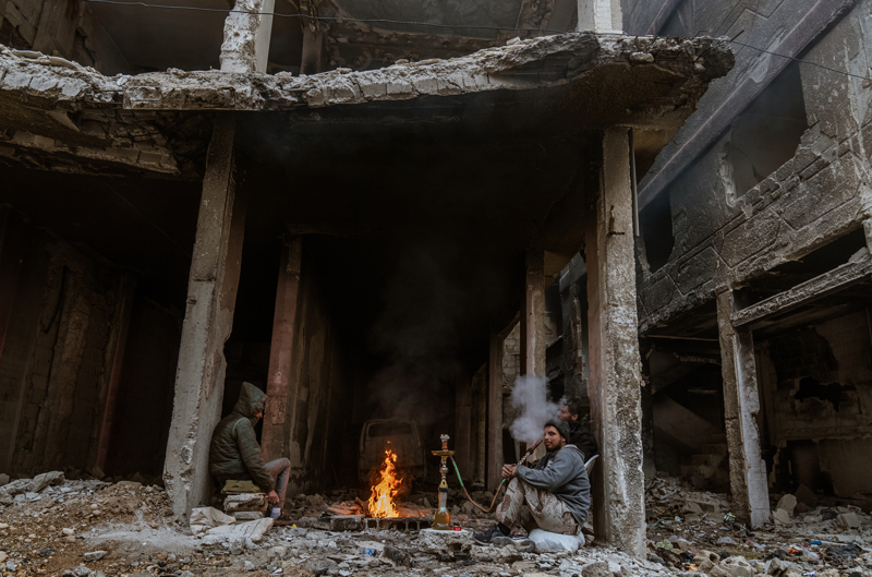 Yermuk Mülteci Kampı'na dönen insanlar savaşın getirdiği yıkım, kışın soğuğu gibi zorlu koşullara tahammül etmeye çalışıyor. Ayağına büyük gelen terliklerle çıplak ayakla gezen bir çocuğun yüzündeki gülümsemesi ise içinde bulunduğu durumla tezat oluşturuyor.