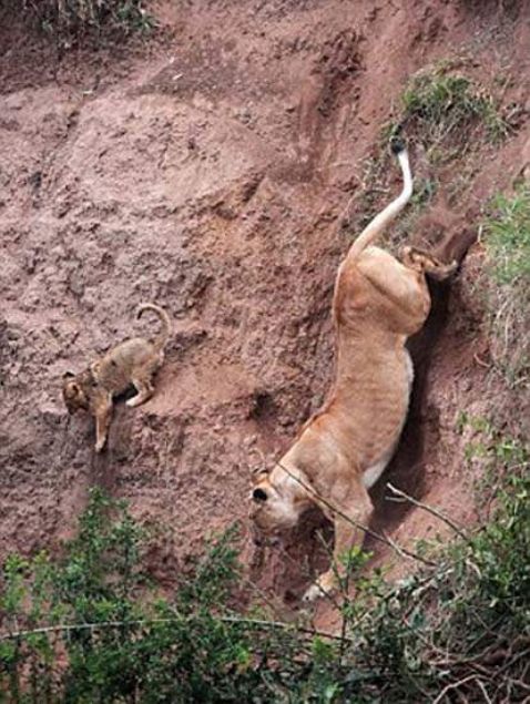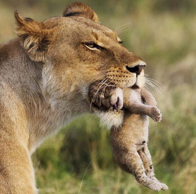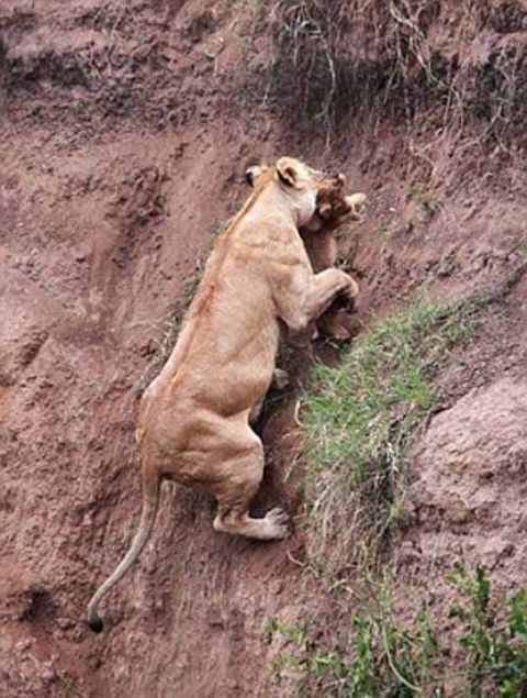 Anne aslan hem azgın sulara kapılmamak için mücadele ederken hem de yavrusunu taşıyor...