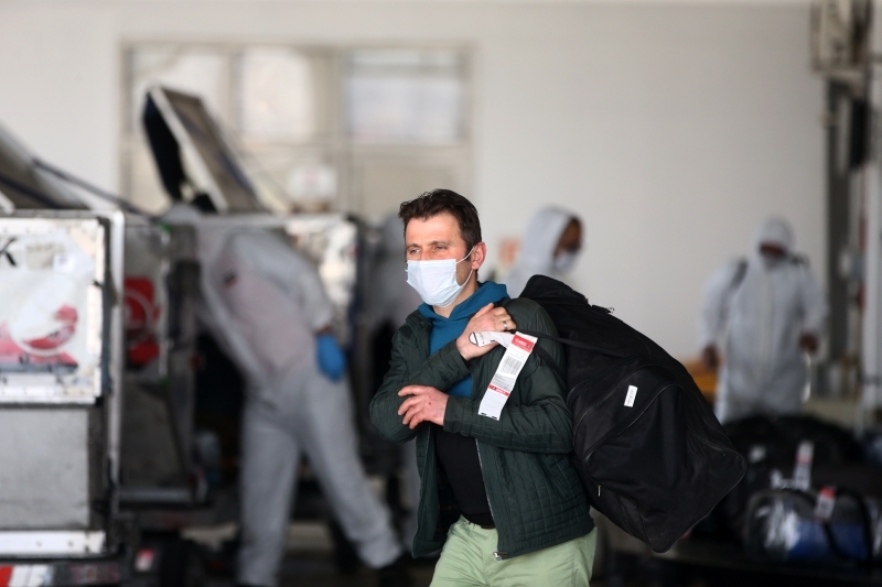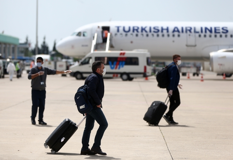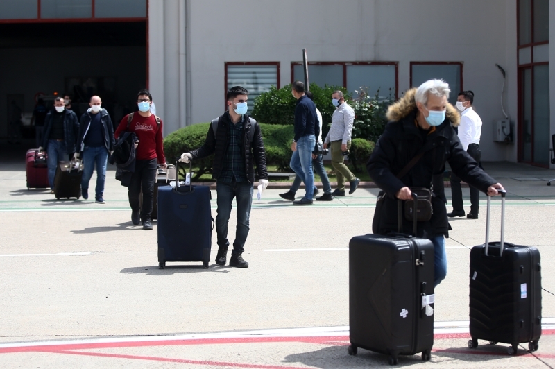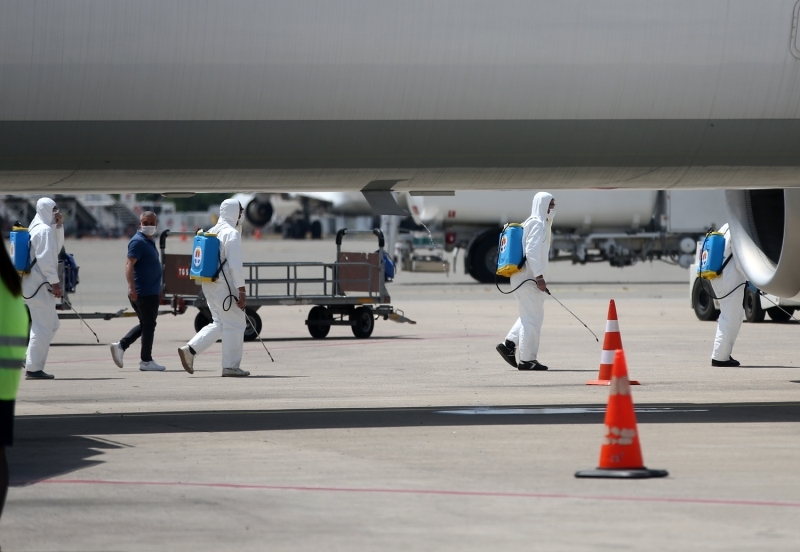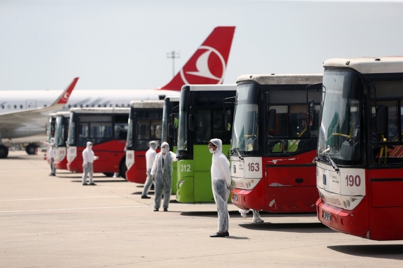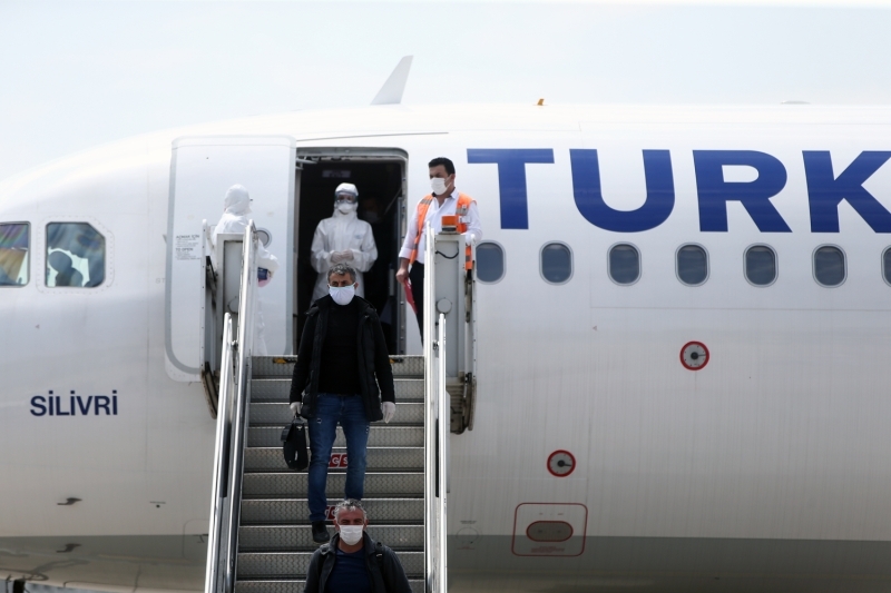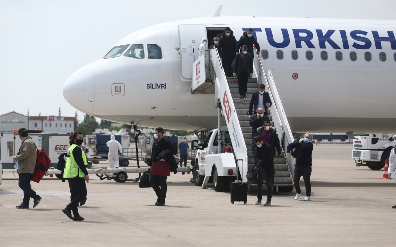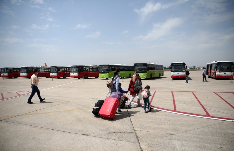 Uçağa giren sağlık ekipleri, yolcuları sağlık kontrolünden geçirdi. Daha sonra pasaport kontrolü yapılan yolcular, apronda bekletilen otobüslere bindirildi.