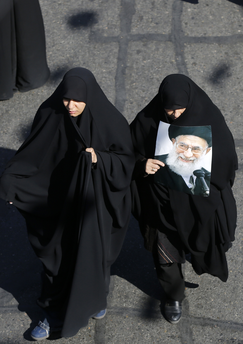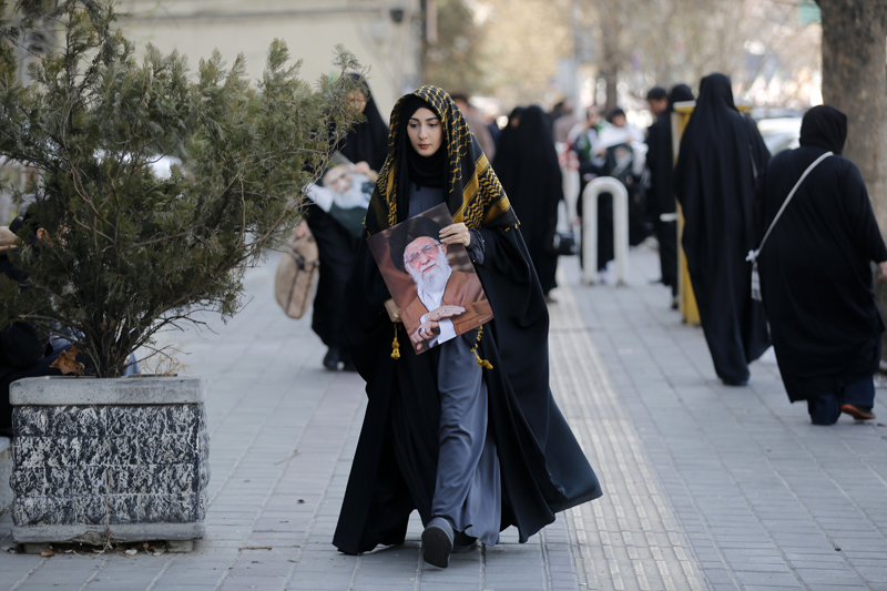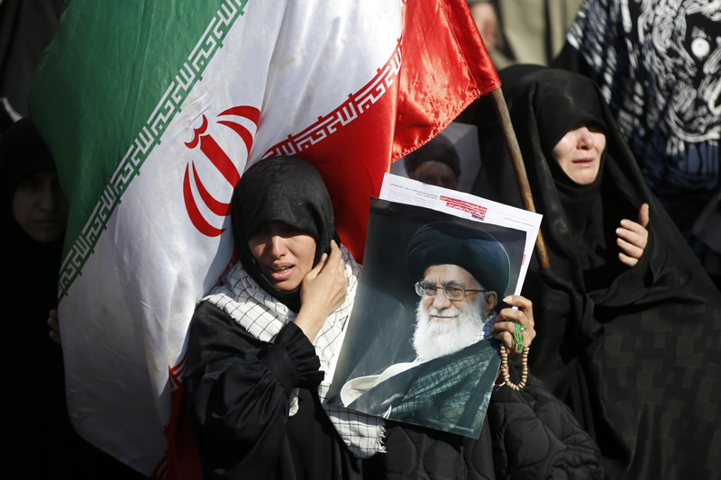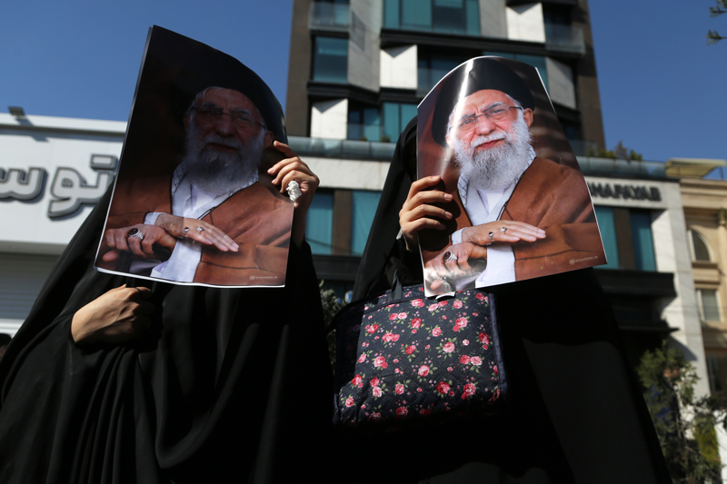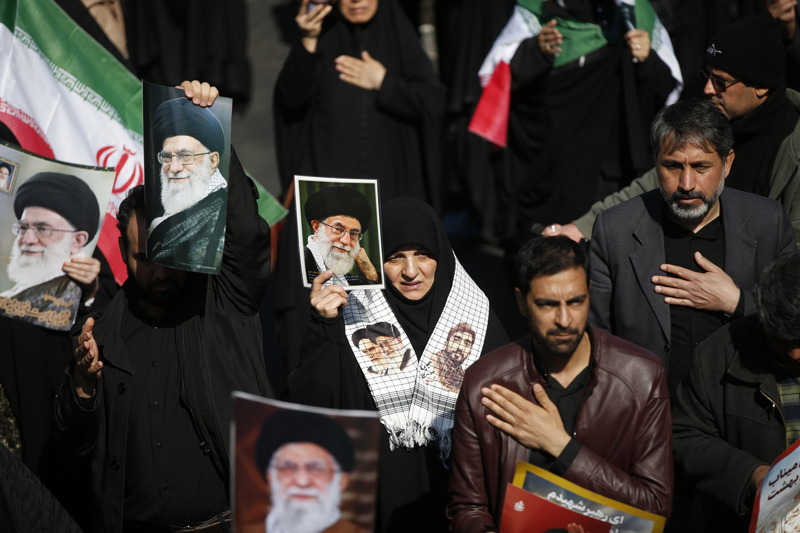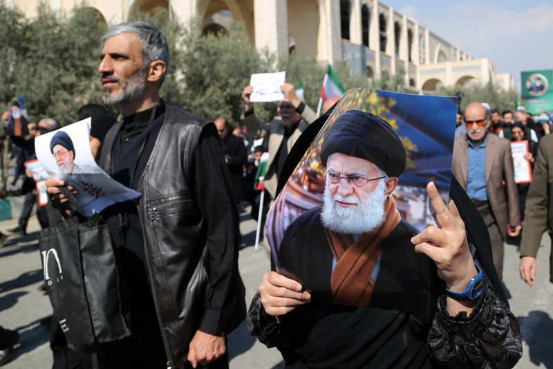 Göstericiler, ellerinde ABD-İsrail saldırılarında öldürülen İran lideri Ayetullah Ali Hamaney'nin fotoğraflarını taşıdı.