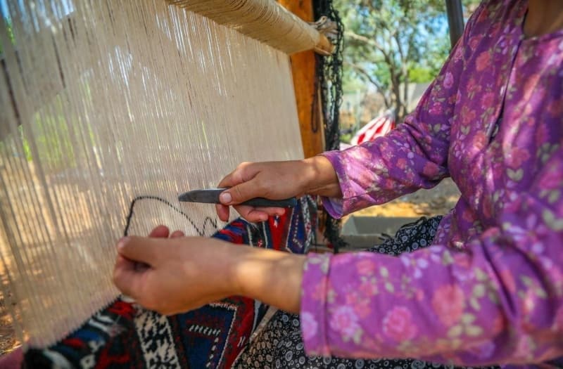 Güneş altında renklerinin pastelleşmesi için serilen halı ve makine dokuması kilimlerin dışında, Döşemealtılı kadınlar el emeği göz nuru orijinal Döşemealtı halıları evlerinin önündeki halı tezgahlarında dokuyor.