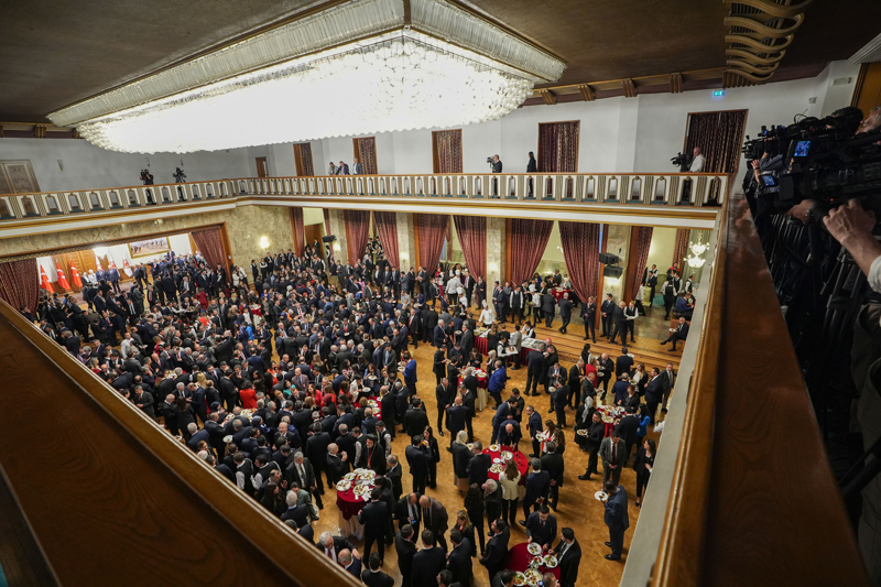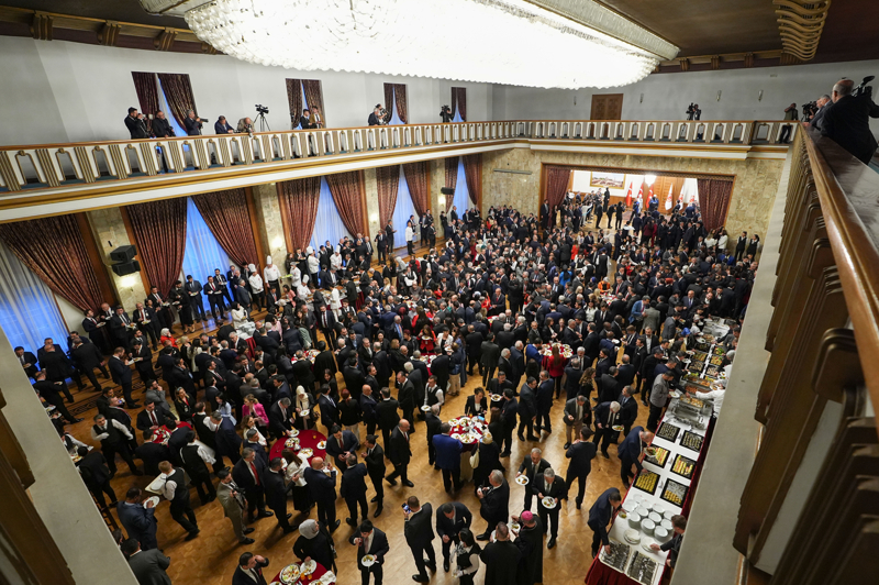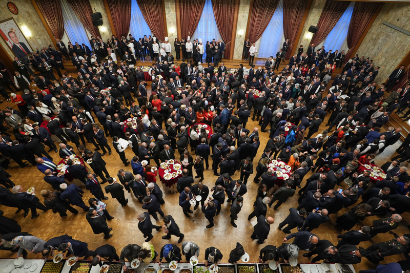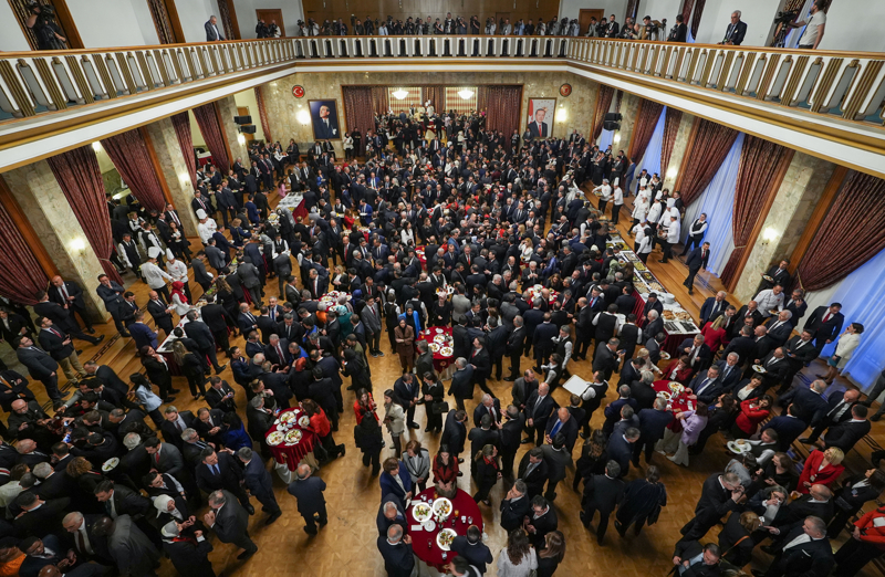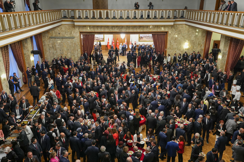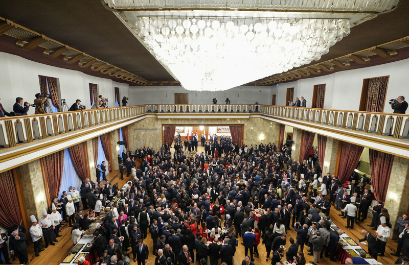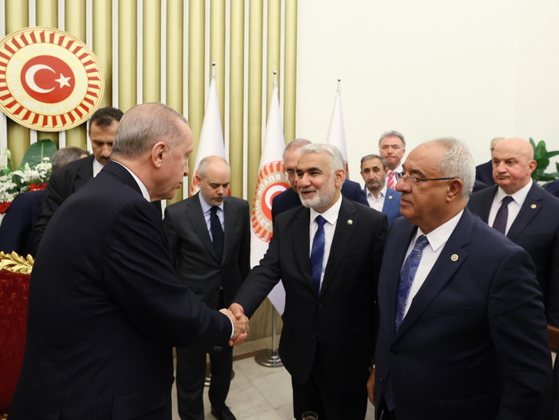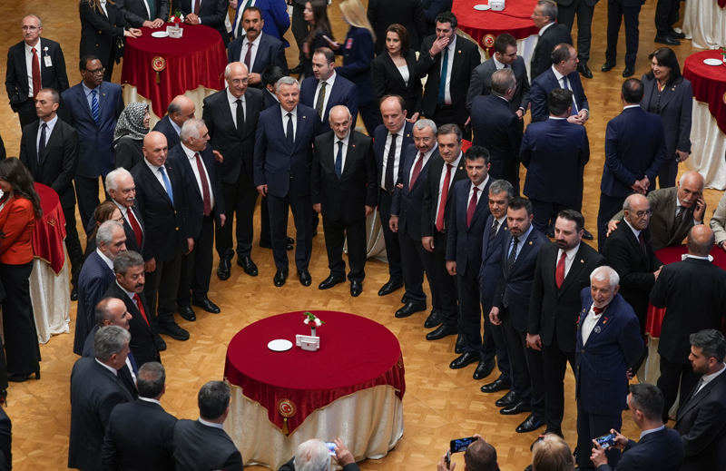 TBMM Başkanı Numan Kurtulmuş eşliğinde resepsiyonun yapıldığı tören salonuna giren Cumhurbaşkanı Erdoğan, bazı davetlilerle sohbet etti.