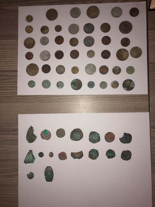 Depoda yapılan aramada 17 sikke, 44 eski madeni para, ruhsatsız tabanca, buna ait 38 fişek, dedektör, toprak altında metal aramaya yarayan 2 bakır tel, 7 metal çubuk ve demir parçası ele geçirildi.