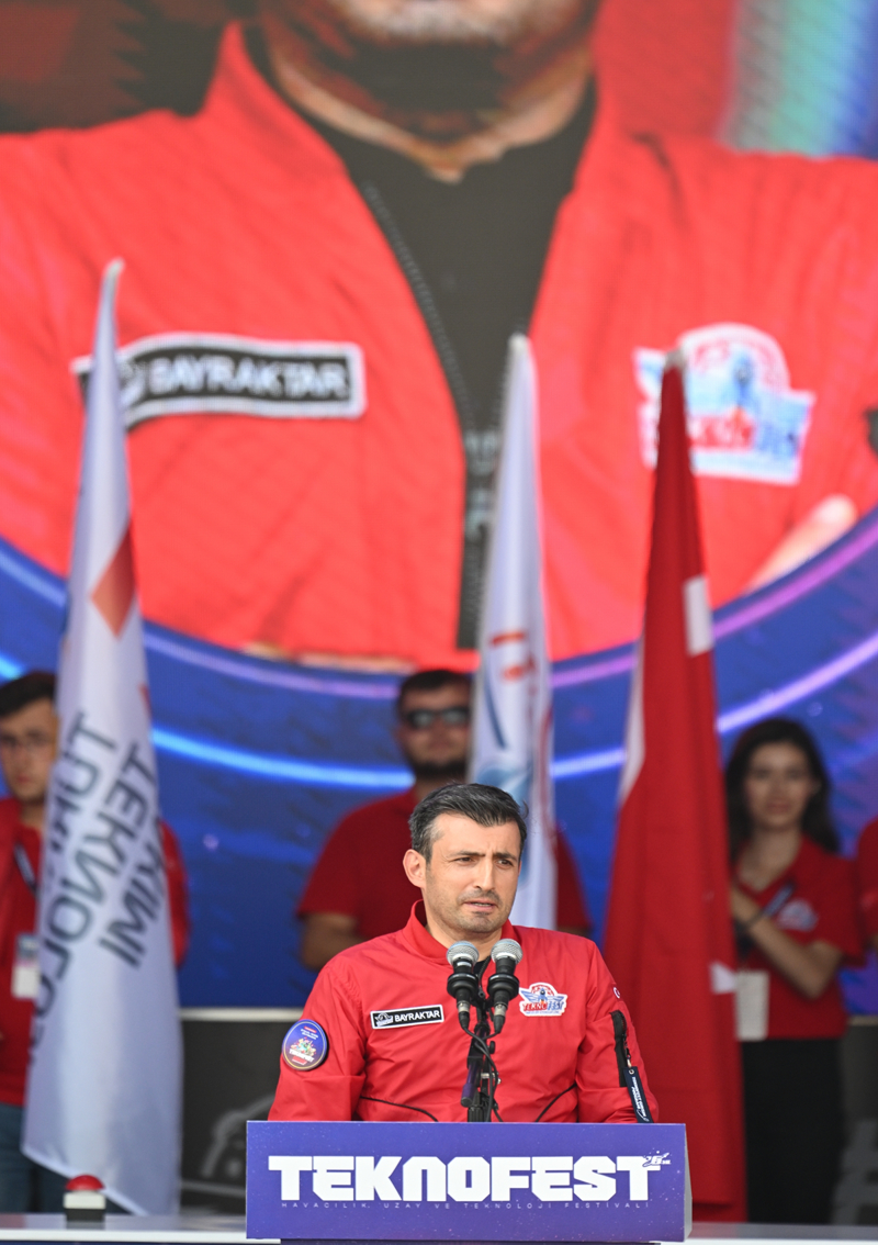 'Böyle inanılmaz bir rekabet, bir dönüşüm ve inanılmaz bir yeniliğin olduğu bir dönemde bizim bu dönüşümün dışında kalmamız, buna uzak kalmamız mümkün olamazdı. Ülkemizin gençleri, soyadında da müsemma olduğu üzere Selçuk Bey'in bayraktarlığını yaptığı bu hareketle gelişmiş ülkelerde durum neyse bizde de bunun olabileceğini, bizim de teknolojide lider olabileceğimizi, dönüşümü hızlı yapabileceğimizi gösteren bir atılım yaptılar. Gençlerimize hakikaten güzel örnek oldular ve bunu da yaptıkları güzel eserlerle İHA'larla SİHA'larla diğer teknolojik ürünlerle gösterdikleri gibi TEKNOFEST gibi olağanüstü bir organizasyonla da başta gençlerimiz olmak üzere tüm kardeşlerimizin, vatandaşlarımızın da beğenisine, ilgisine, bilgisine sundular.'