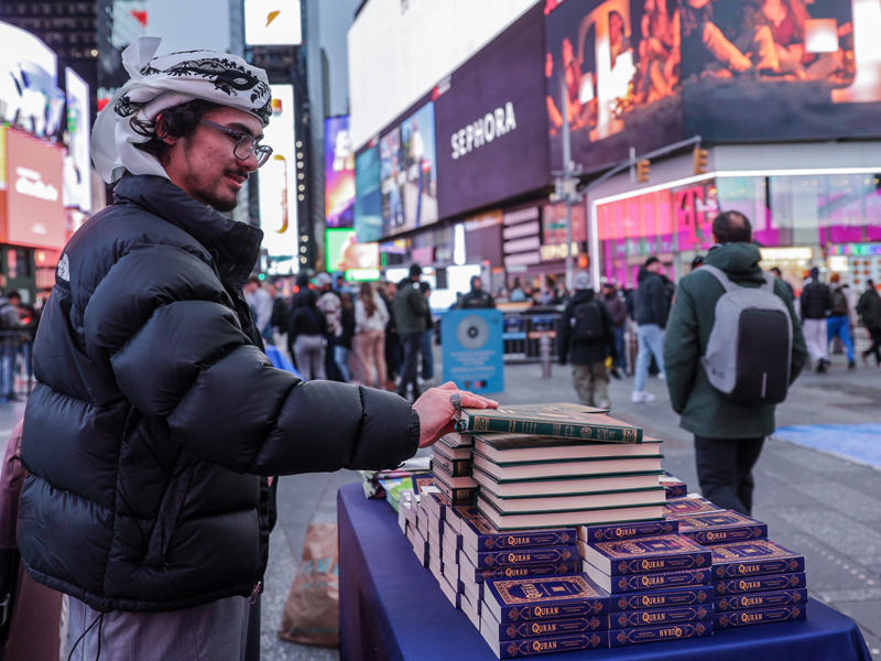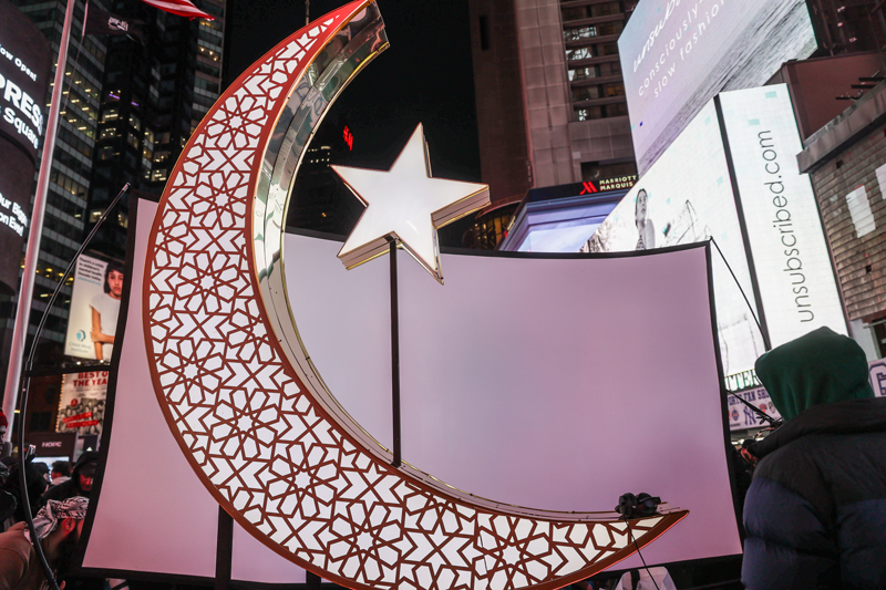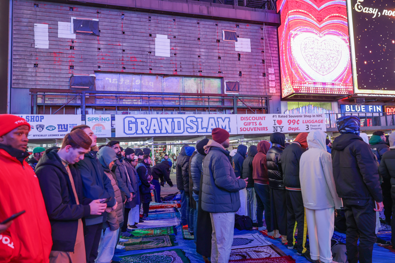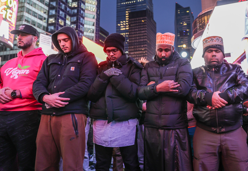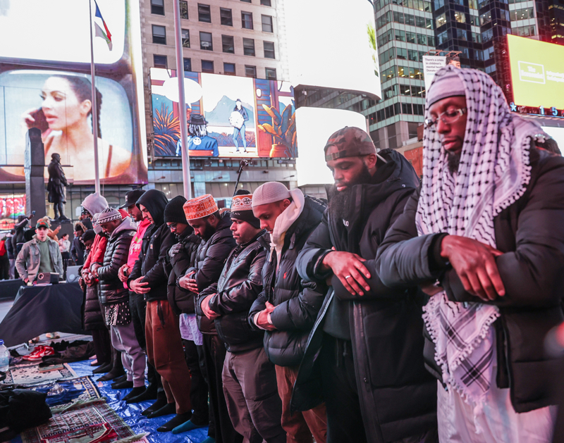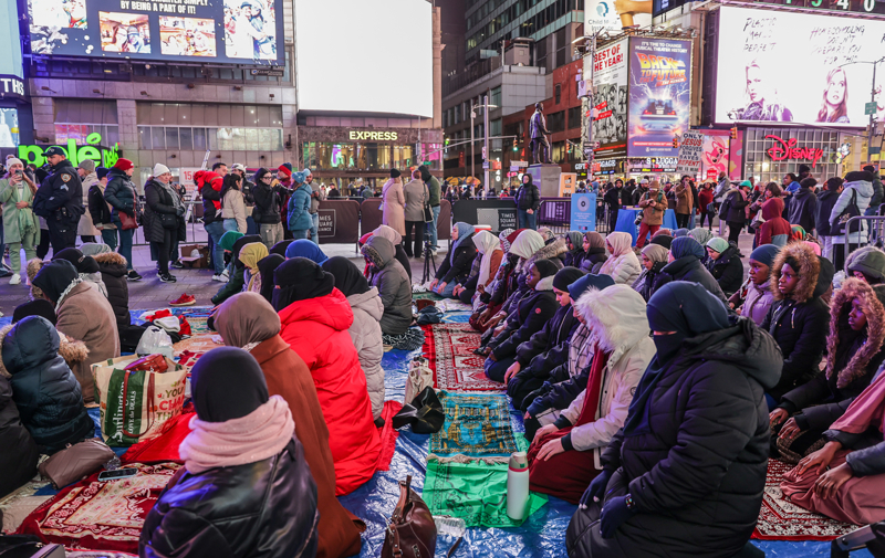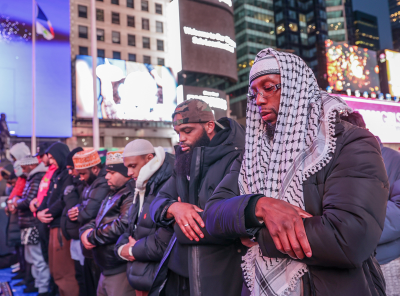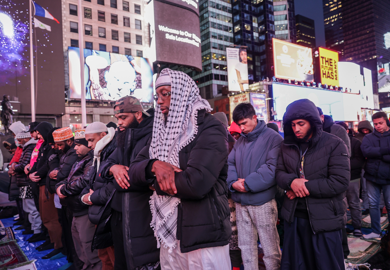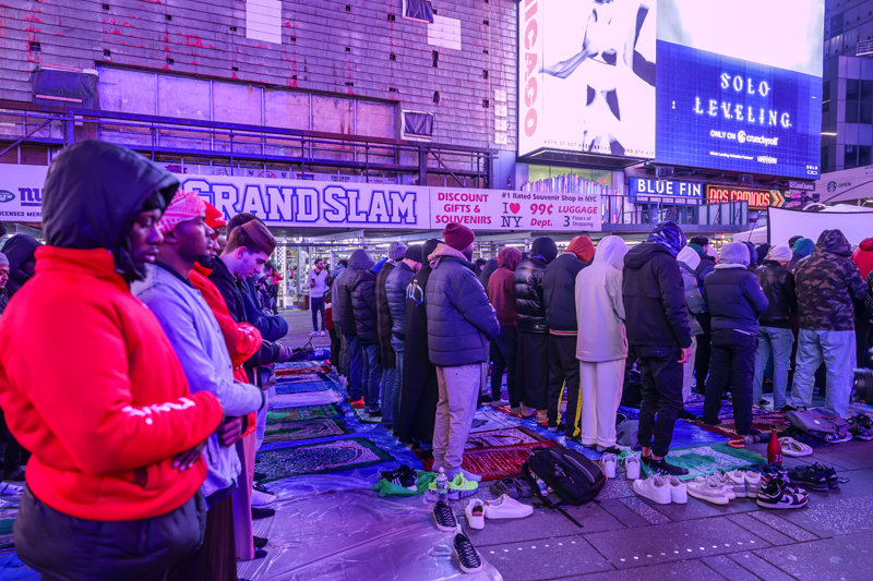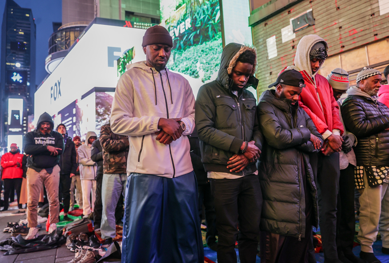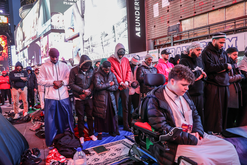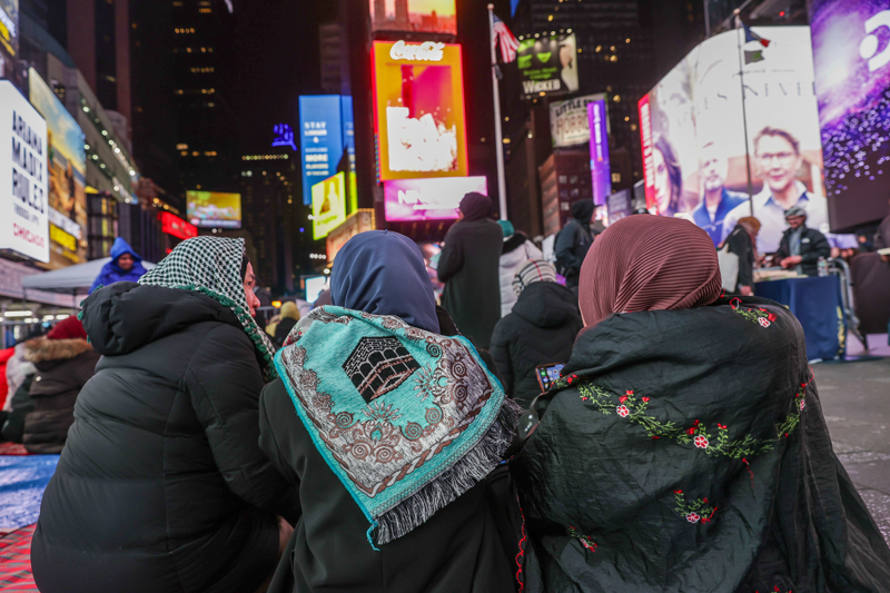 ABD'nin New York kentinde yaşayan Müslümanlar, Times Meydanı'nda bir araya gelerek Ramazan ayının ilk teravih namazını kıldı.