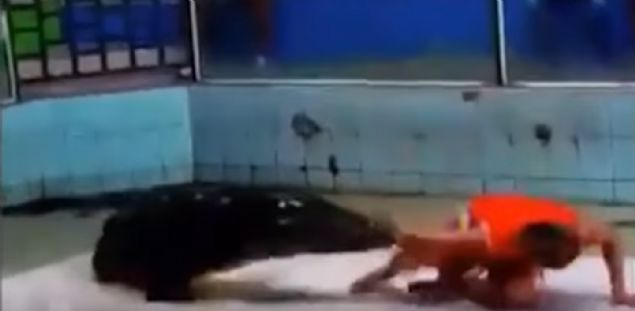 Timsahın dönmesiyle beraber kolunu kaptıran eğitmen de aynı anda yan dönüp kolunu kurtarmayı başardı.