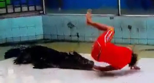 Gösteri sırasında adamın elini kapan timsah seyircileri şoke etti.