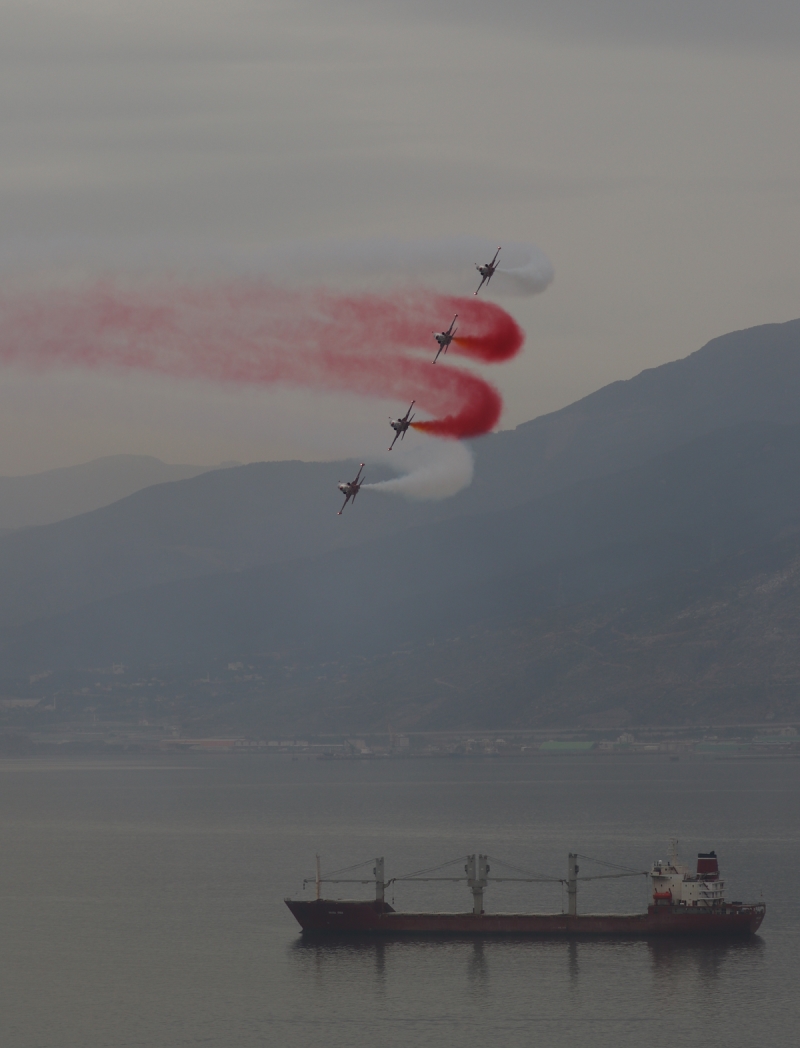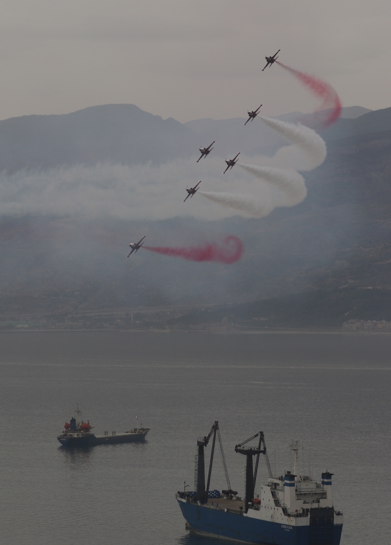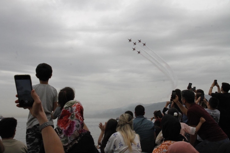 Gösteriye yoğun ilgi gösteren ilçe sakinleri, sahil kordonunda cep telefonu kameralarıyla etkinliği kaydetti.
