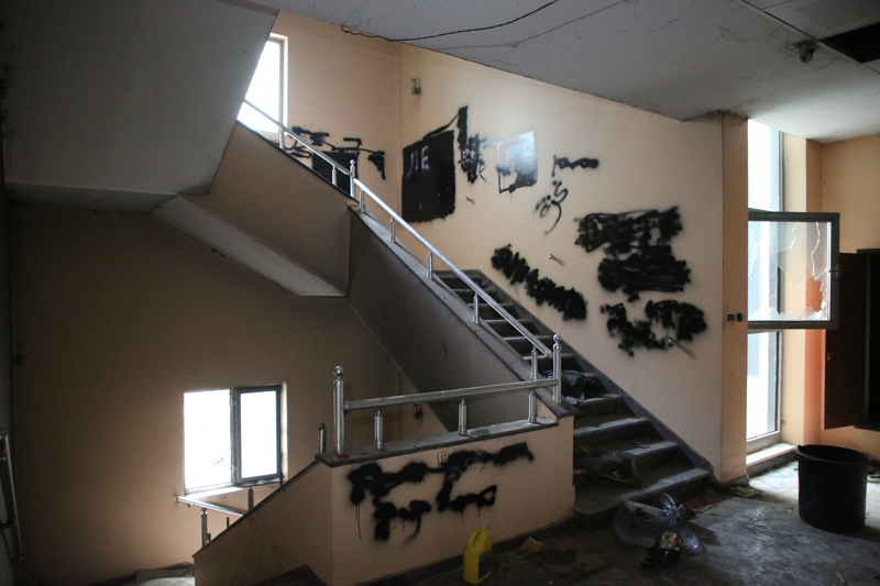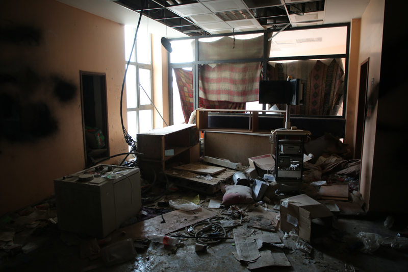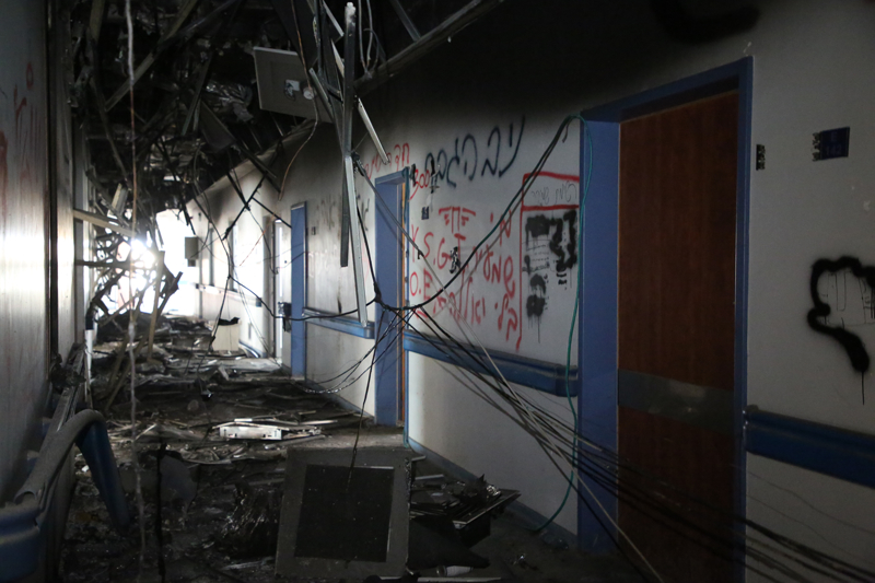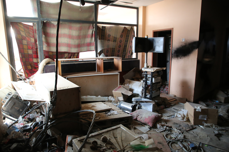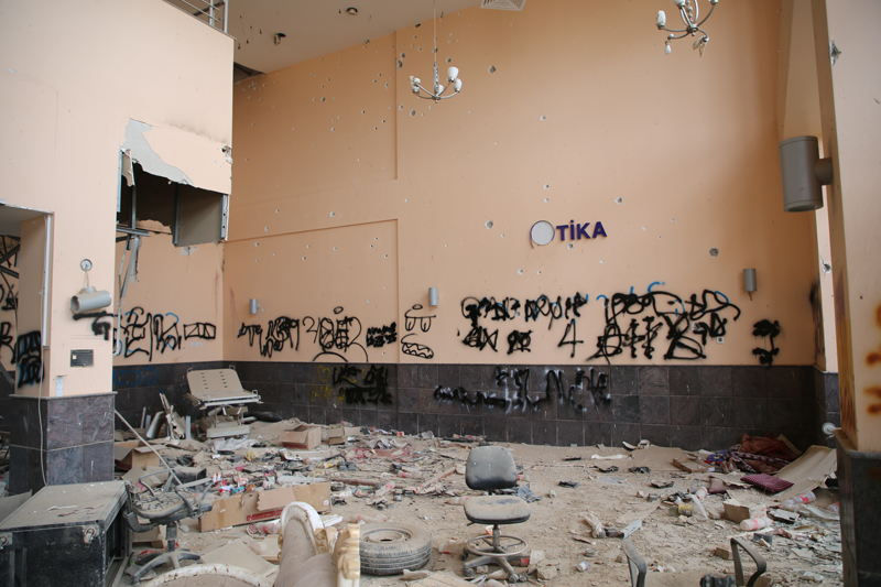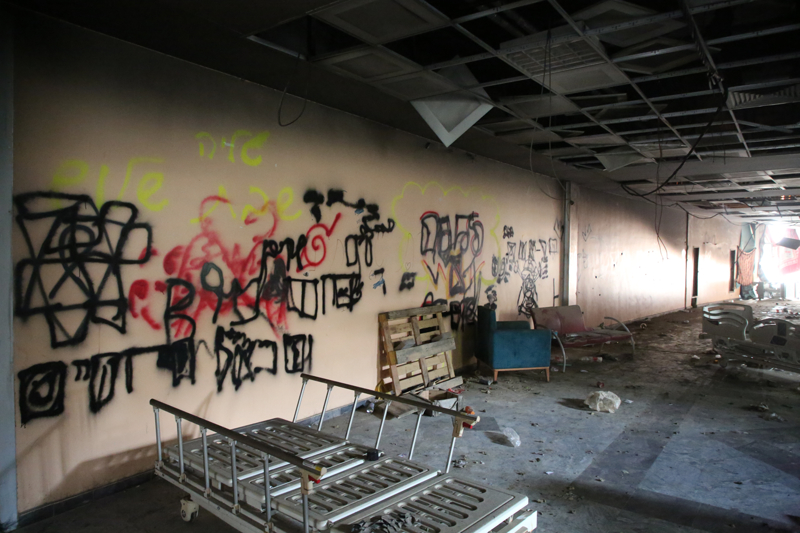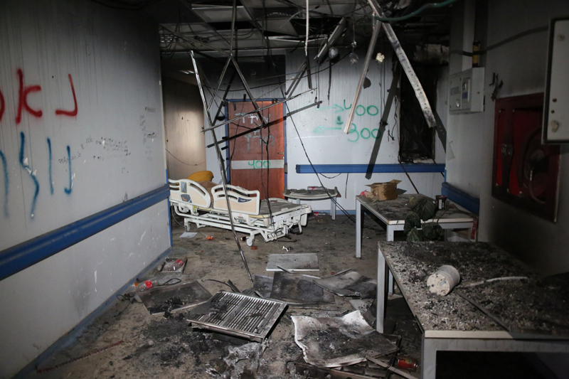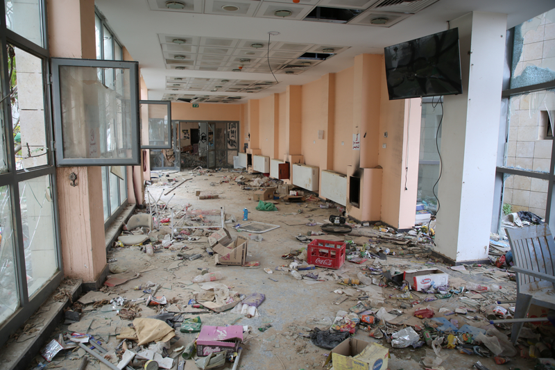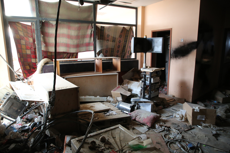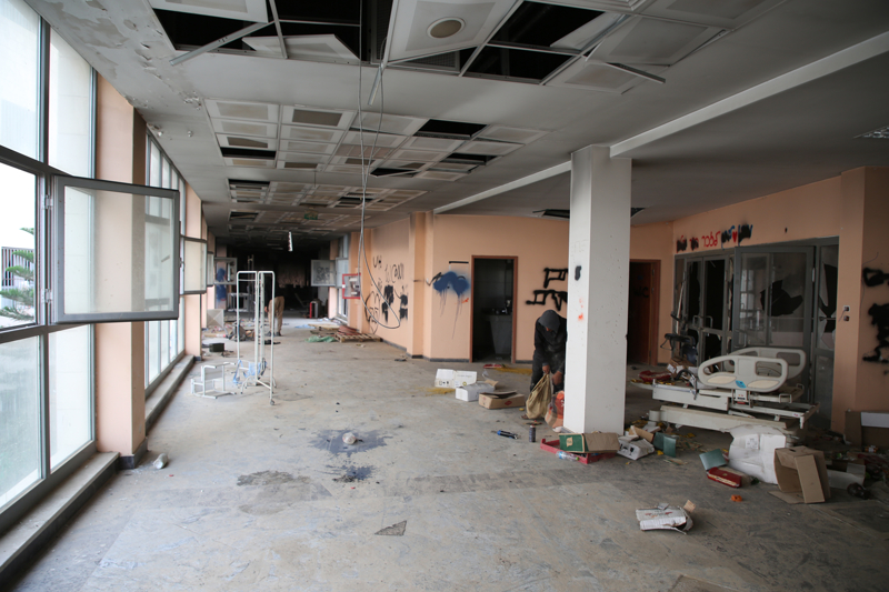 Tanınmayacak hale gelen hastanenin bir kısmının yandığı görülürken, hastanenin büyük kısmının tahrip edilmesi, camlarının neredeyse tamamının kırık olması dikkati çekiyor.