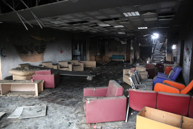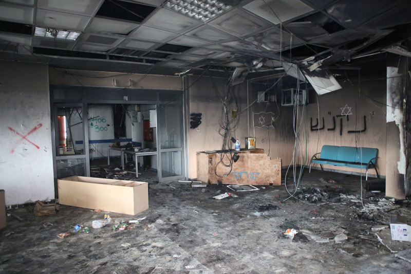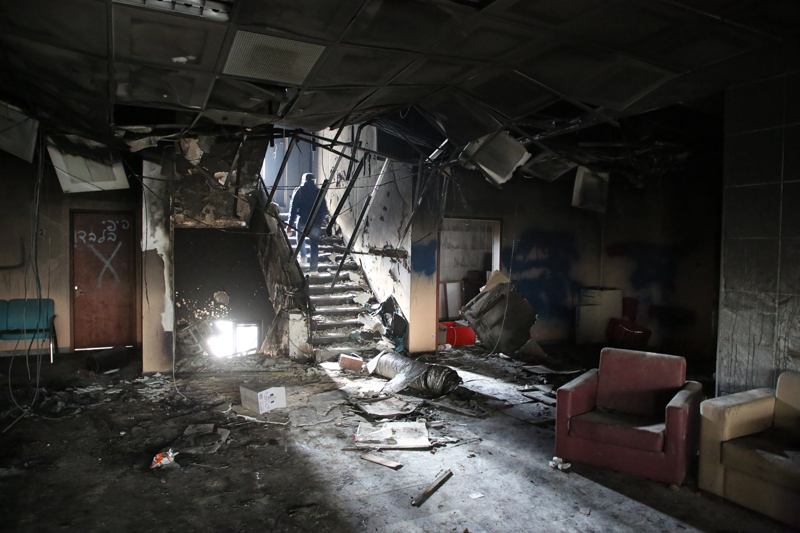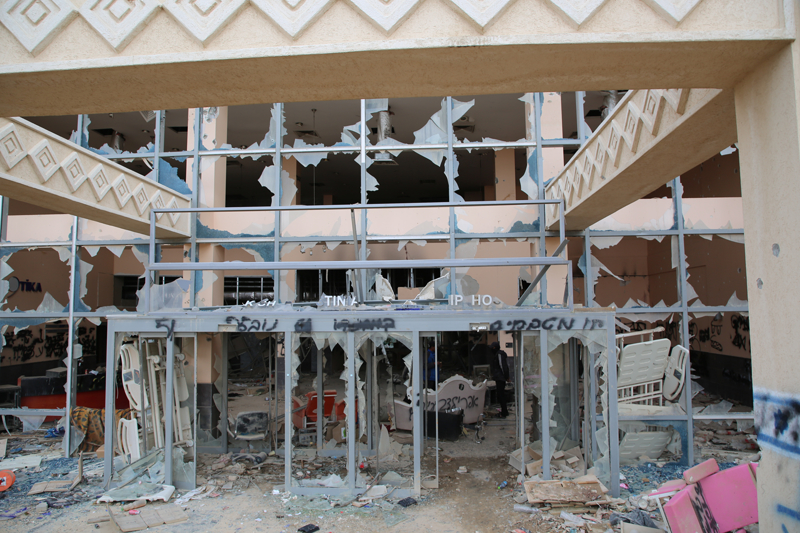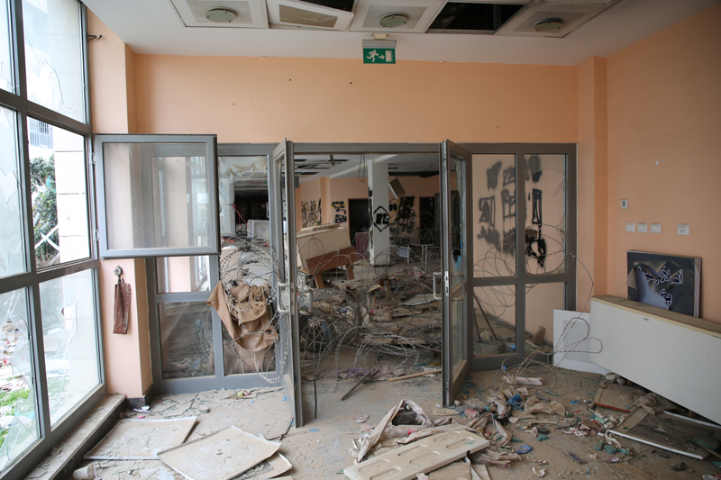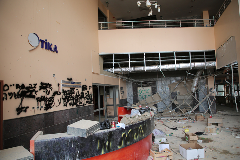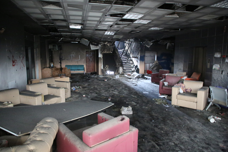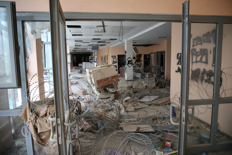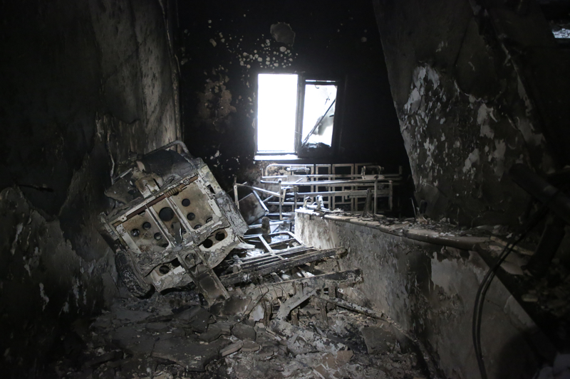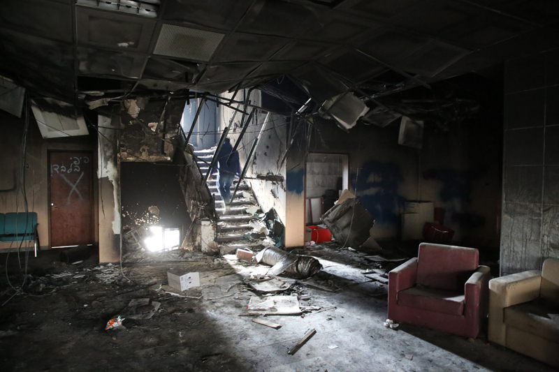 Tanınmayacak hale gelen hastanenin bir kısmının yandığı görülürken, hastanenin büyük kısmının tahrip edilmesi, camlarının neredeyse tamamının kırık olması dikkati çekiyor.