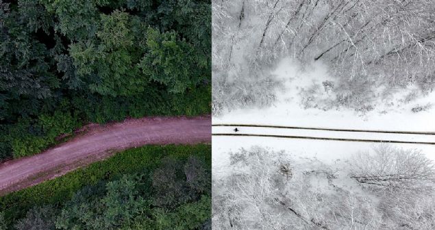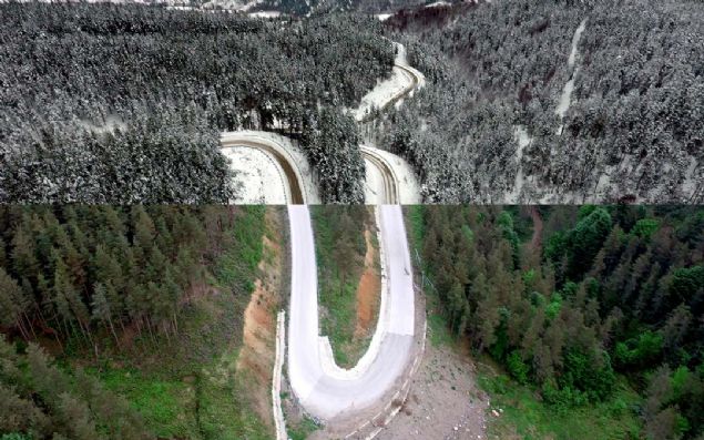 Bir yarısı kar, diğer yarısı yemyeşil bahar ve yaz manzaralarından oluşan fotoğraflarda Türkiye'nin doğusundan batısına, kuzeyinden güneyine özellikle orman ve yollardaki mevsimsel değişiklikler göze çarpıyor.