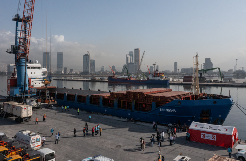 İzmir Alsancak Limanı'na dün gece demirleyen kuru yük gemisine, görevlilerce tıbbi malzemeler ve ambulanslar yükleniyor.