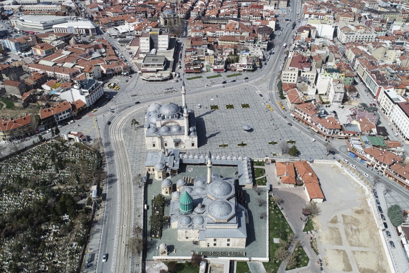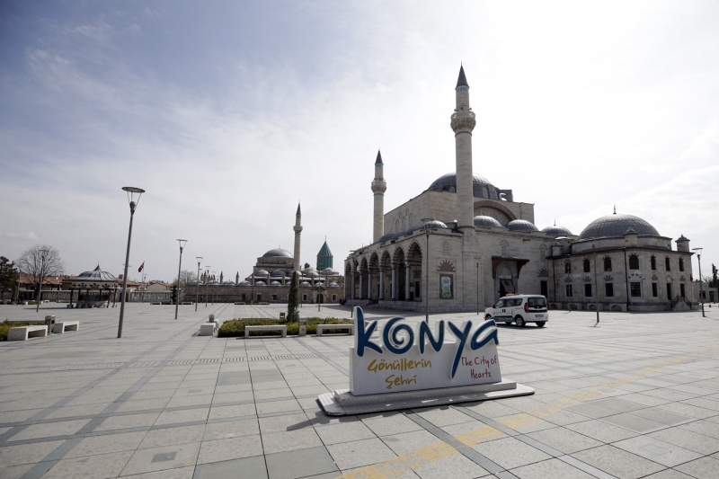 Konya'da en yoğun alanlardan olan Mevlana Meydanına, sakinlik hakim oldu.