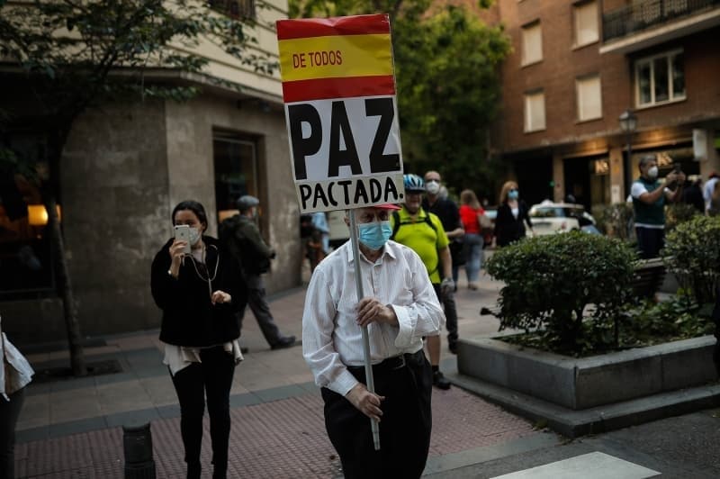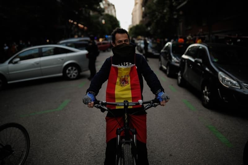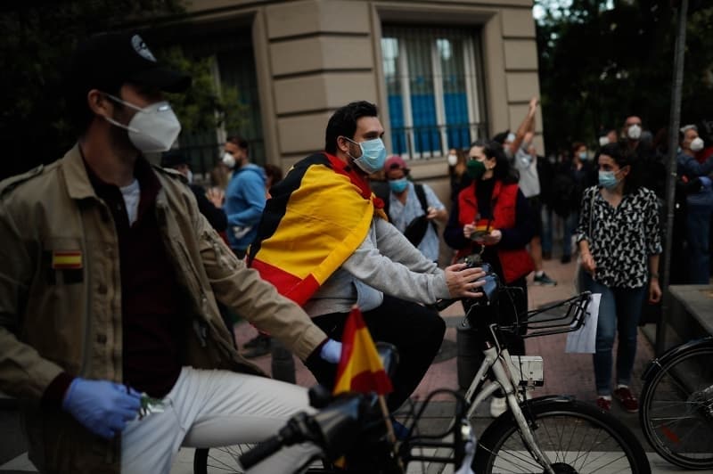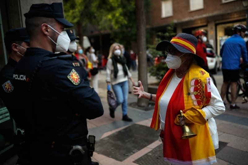 İspanyol bayrakları taşıyan gruplar, hükümetin belirlediği kademeli normalleşme sürecini, olağanüstü halin devam etmesini ve Kovid-19'dan etkilenen ülke ekonomisiyle ilgili alınan önlemleri eleştiriyor.