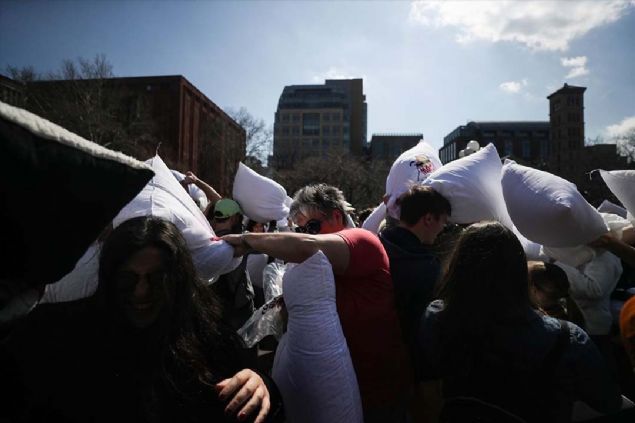 New York'un ünlü mekanlarından Washington Meydanı'nda toplanan binlerce kişi yastık savaşı yaptı. Her yıl geleneksel olarak kutlanan Uluslararası Yastık Savaşı Günü bu yıl da renkli görüntülere sahne oldu.
