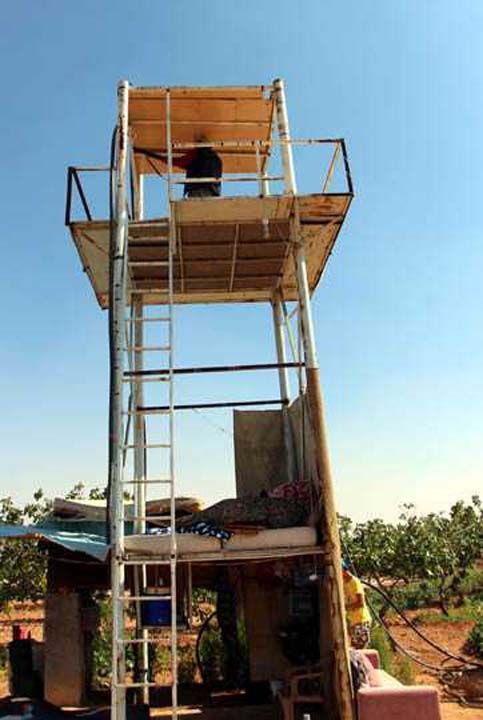 Arazi sahipleri fıstık bahçelerine askeri birliklerdeki kuleleri anımsatan 15-20 metre yükseklikte nöbet kulübeleri yaptırarak bekçi tutuyor.