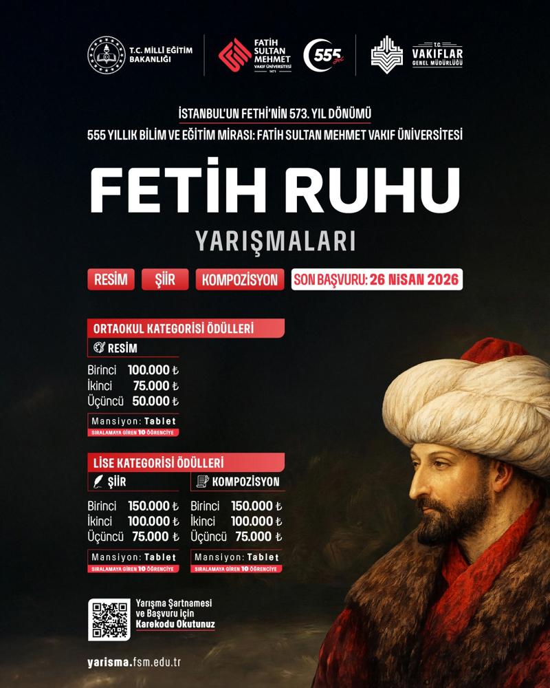 Fatih Sultan Mehmet Han Vakfı'nın 555 yıllık bilim ve eğitim mirasının bugünkü kurumsal temsilcisi olan Fatih Sultan Mehmet Vakıf Üniversitesi, kuruluşunun 555. Yıldönümü ve İstanbul'un Fethi'nin 573. Yılı dolayısıyla gençlere yönelik anlamlı bir etkinliğe imza atıyor. Millî Eğitim Bakanlığı iş birliğinde düzenlenen "Fetih Ruhu" temalı yarışma için başvuru süreci devam ediyor. Gençlerin tarihî mirasa yönelik farkındalığını artırmayı amaçlayan yarışma, İstanbul'un fethini bir medeniyet ideali ve değer üretme bilinci çerçevesinde ele alıyor.
