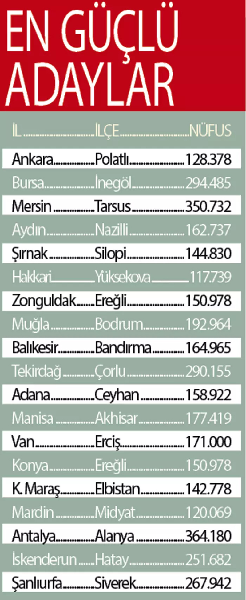 Nüfusu en az 100 bin ve bağlı bulundukları vilayetlere en az 30 kilometre mesafede bulunan çok sayıda ilçeye mercek tutuldu. İlçelerin ekonomik yapısı, şehirleşme durumu, ulaşım alt yapısı gibi çok çeşitli alanlarda yapılacak incelemeler sonrasında il olacak 19 ilçe belirlenecek. Edinilen bilgiye göre, Başkan Erdoğan ve Bahçeli görüşmesinde konu gündeme gelir ve karar alınırsa AK Parti ve MHP kurmaylarının yaptığı çalışmalar hızlandırılarak konu TBMM gündemine taşınacak.