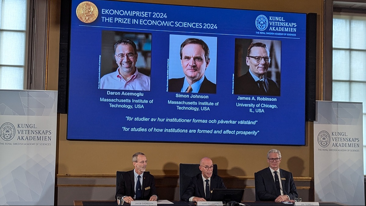 Açıklamada, 2024 Nobel Ekonomi Ödülü'nü, kurumların oluşumu ve refaha etkilerine ilişkin çalışmalarından dolayı Türk Prof. Dr. Daron Acemoğlu, İngiliz Prof. Dr. Simon Johnson ve İngiliz Prof. Dr. James Robinson'un kazandığı bildirildi.