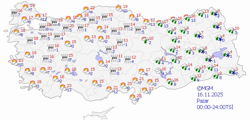 Karla karışık yağmur beklenen Adıyaman, Bingöl, Bitlis, Elazığ, Erzincan, Erzurum, Giresin, Hakkari, Kayseri, Malatya, Muş, Ordu, Samsun, Sivas, Tokat, Tunceli, Şanlıurfa, Van, Şırnak ile kuvvetli yağış beklenen Diyarbakır, Mardin, Siirt ve Batman için "sarı" kodlu uyarıda bulunuldu.