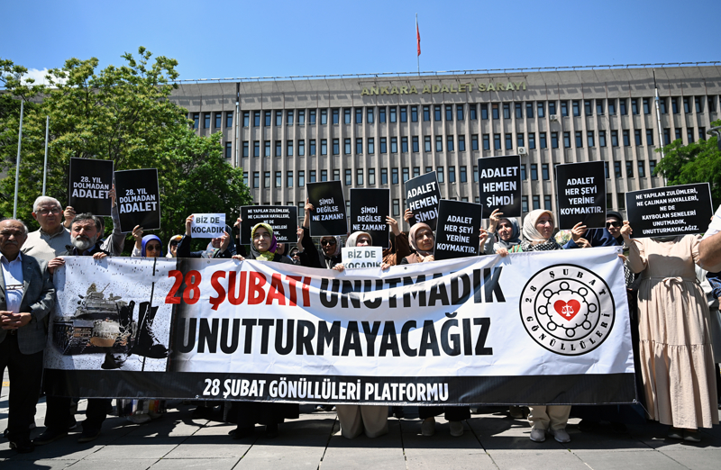 Ankara Adliyesi önünde toplanan 28 Şubat Gönüllüleri Platformu üyeleri, çeşitli sivil toplum kuruluşlarının da katılımı ile "28 Şubat'ı unutmadık, unutturmayacağız" yazılı pankart açtı.