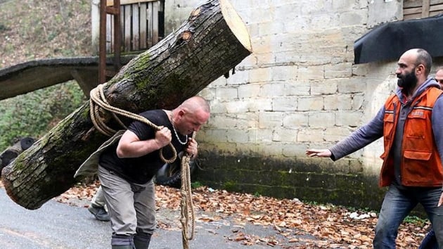 Rize'de 'Rambo' olarak bilinen Ramazan Çepni, 283 kilogram ağırlığındaki kütüğü sırtında 58 adım taşımayı başardı.