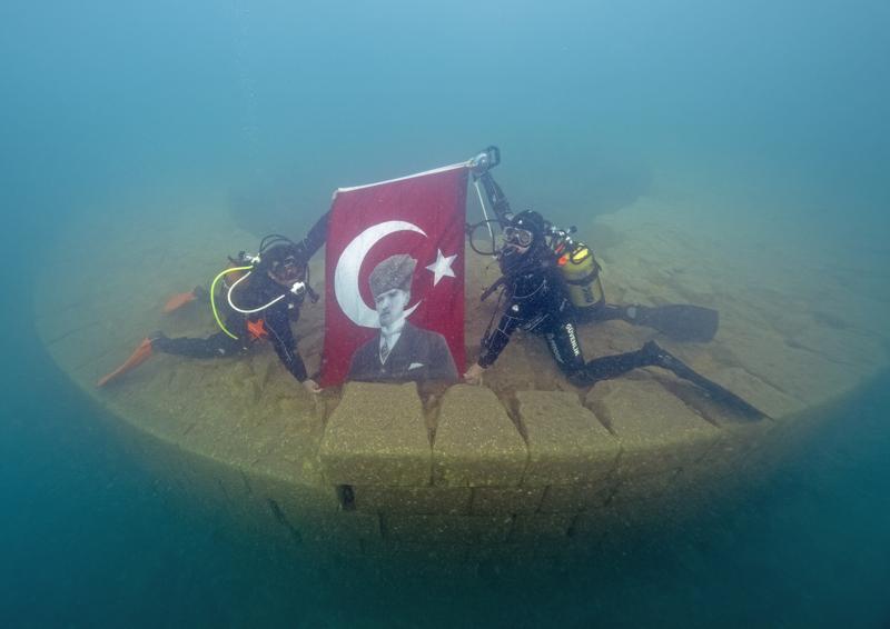 Mikrobiyalitlerdeki su çıkışını kayıt altına alan Ceylan ve beraberindekiler, Van Gölü'nün derinliklerinde Türk bayrağı açarak Cumhuriyet'in 101. yıl dönümünü kutladı.