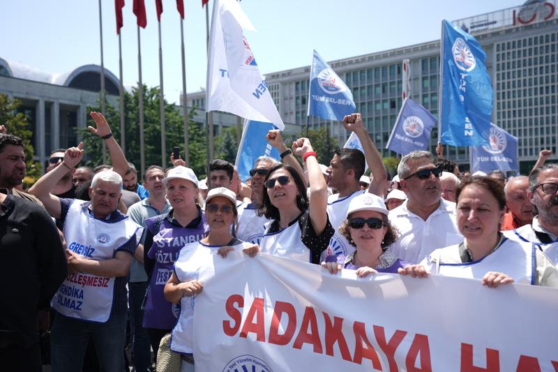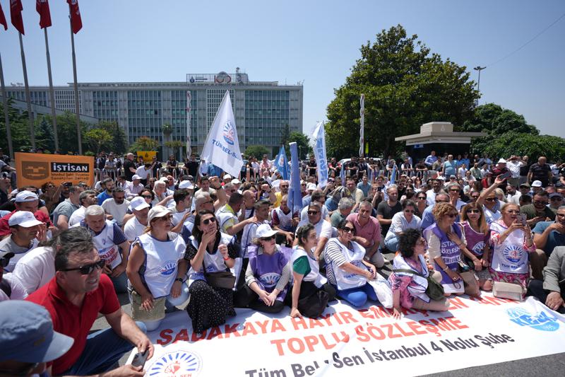 "Sadakaya Hayır, Emekçiden Yana Toplu Sözleşme" yazılı pankart açan üyeler, "Ekrem Başkan sesimizi duy", "Yönetim uyuma, memuruna sahip çık", "Birleşe birleşe kazanacağız" şeklinde sloganlar attı.
