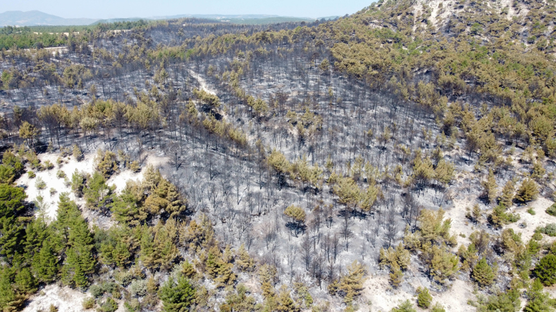 Rüzgarın da etkisiyle kısa sürede büyüyen yangının ardından, bölgede yanan alanlar gri ve siyaha büründü.