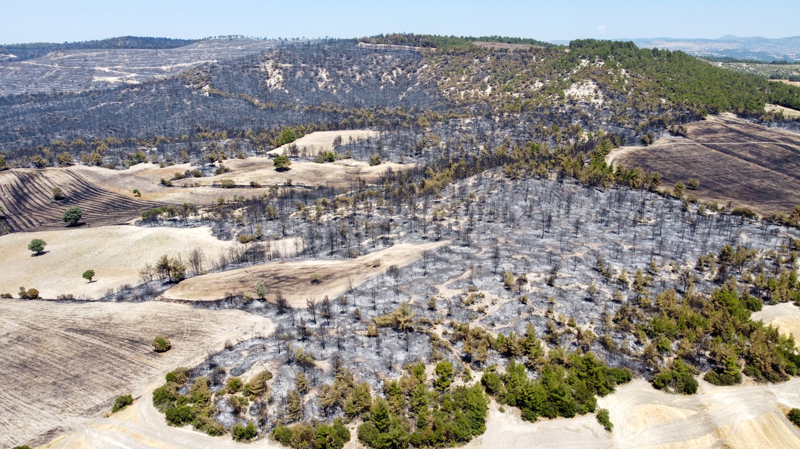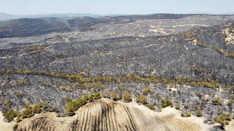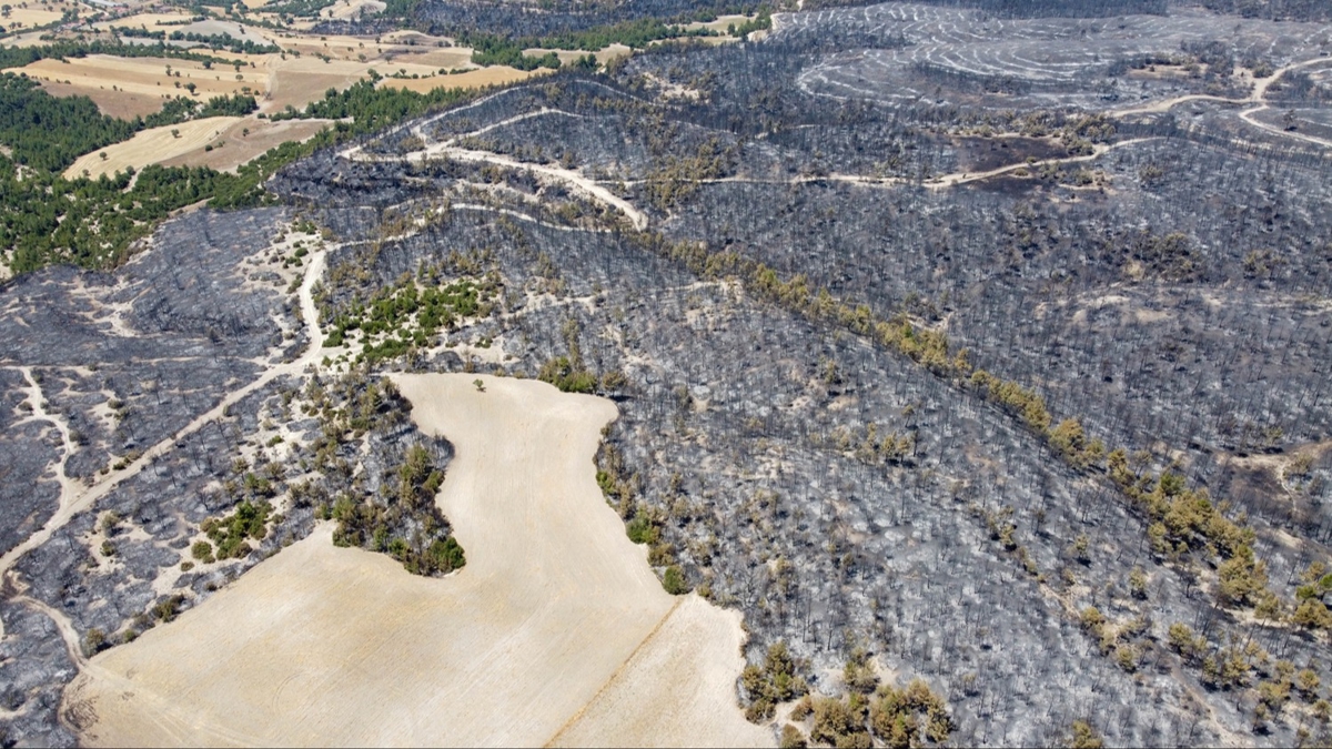 AA ekibince dronla havadan çekilen görüntülerde, alevlerin zarar verdiği tarım arazileri ile ormanlık alan yer aldı.
