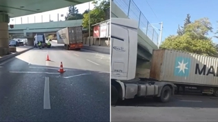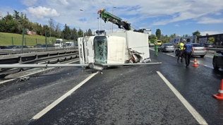 Bakırköy'de, üst geçide çarpan İstanbul Su ve Kanalizasyon İdaresine (İSKİ) ait vinç devrildi.