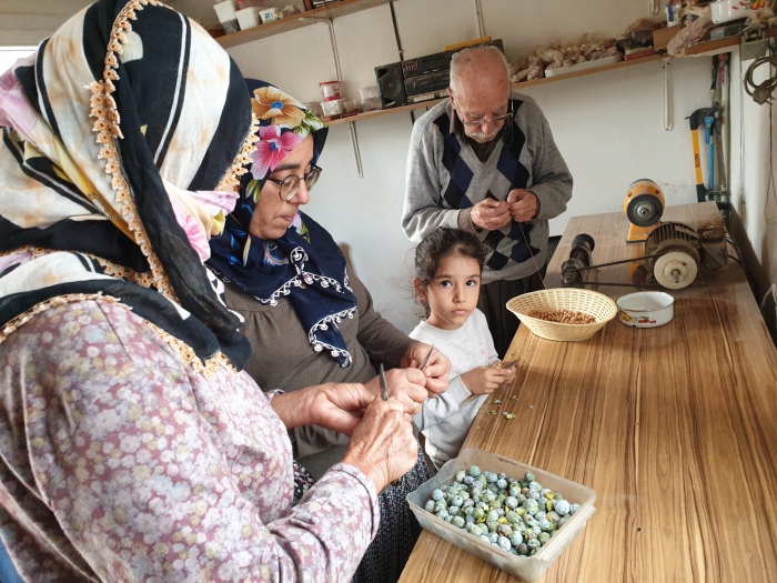 Zaman zaman 2 oğlu, gelinleri ve torunlarının da yardım ettiği İspir, kokusu, doğallığı, çekim kolaylığı ve ipeksi dokunuşu nedeniyle tercih edilen andız çekirdeğinden günde 2 veya 3 tespih üreterek internet üzerinden 100 ila 200 liraya satıyor.