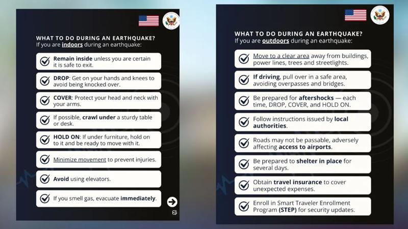 Büyükelçiliğin paylaşımında, deprem anında ve sonrasında izlenmesi gereken adımlar anlatıldı. Yaralanma riskini azaltmak için "Çök, Kapan, Tutun" kuralının hayati öneme sahip olduğu belirtildi.