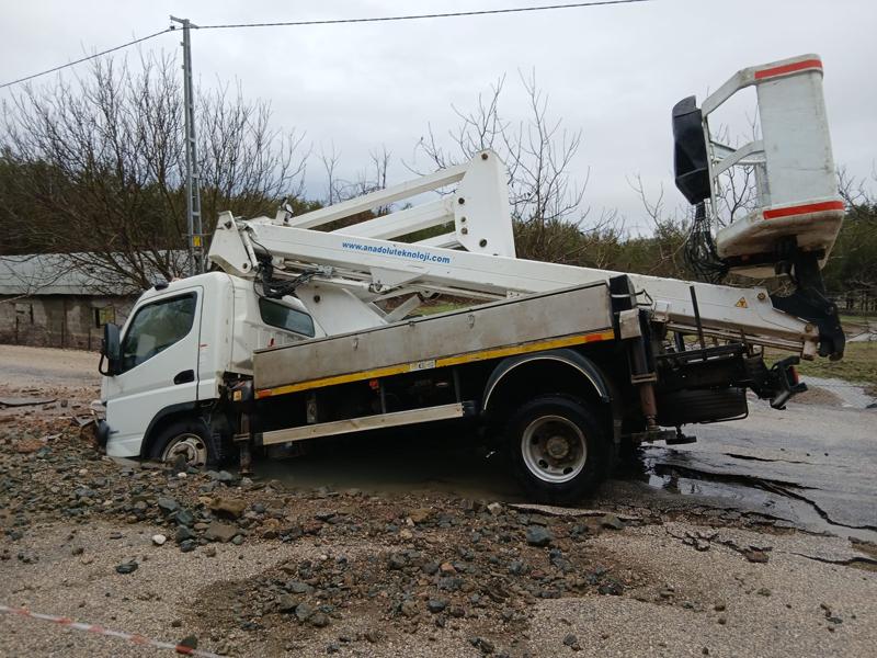 Yolda oluşan çukura platformlu bir araç düştü.