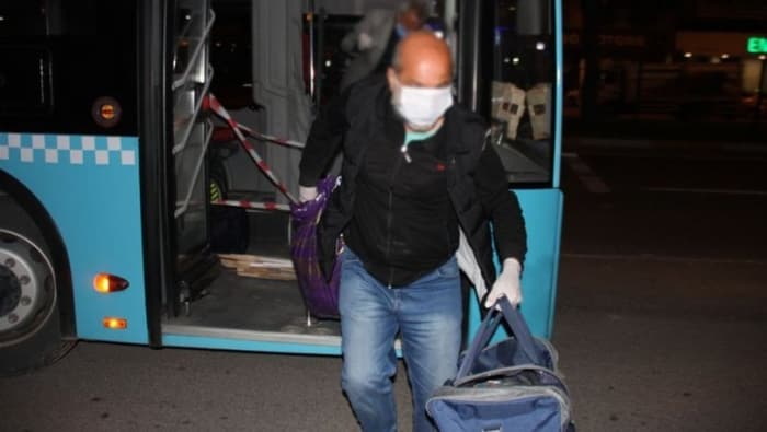 Tahliye edilenlerin bindikleri otobüslerde sosyal mesafe kuralına uyulduğu ve tahliye edilenlerin maske taktıkları görüldü.