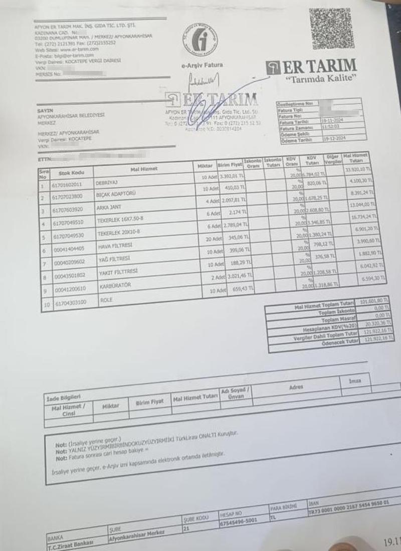 Afyonkarahisar'da kent siyasetini karıştıran olay, sosyal medyada fatura skandalı diye büyüyerek devam ediyor. Erhan'ın sahibi olduğu Er Tarım isimli şirketinden belediyeye 14 Ekim 2020'de 3 ayrı şekilde 136 bin 721 TL, 37 bin 989 TL, 67 bin 194 TL ve 21 bin 071 TL'lik fatura kesildiği ortaya çıkarken, şirketten aynı zamanda kasım ayında ise 121 bin TL'lik fatura kesildiği orta çıktı.