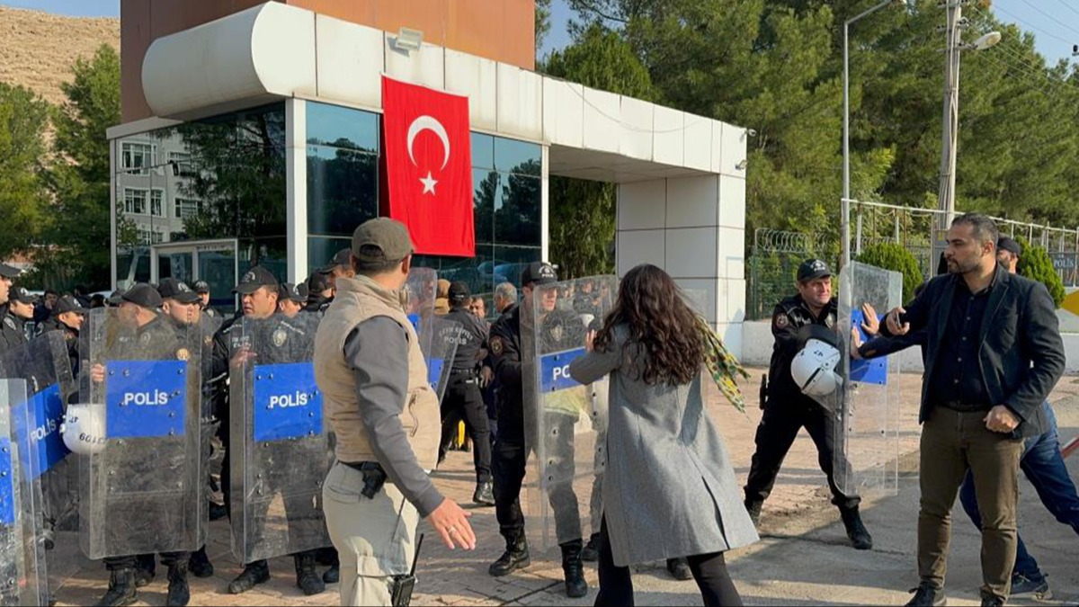 Mardin Büyükşehir Belediyesine Vali Tuncay Akkoyun'un kayyum olarak atanması sonrası DEM Partililer Ahmet Türk ile birlikte belediye binasına girmek istedi.