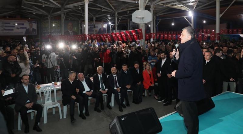 "Ramazanın sonunda Ramazan Bayramı var ama bu sefer iki bayram birden yapacağız. Biri Ramazan Bayramı diğeri 31 Mart'ta demokrasi bayramı. 31 Mart'ta büyükşehirde Fatih Mehmet Kocaispir'i, Yüreğir'de Halil Nacar'ı sandıktan çıkararak demokrasi bayramını kutlayacağız. Artık son viraja girdik. Mahallelerinize, akrabalarınıza, komşularınıza gidin. Geçen seçimde farklı partilere oy kullanmış bütün vatandaşlarımıza şunu söyleyin; 'Gelin bu sefer eser, hizmet siyasetinin temelinde birleşelim.' Altılı, yedili masa genel seçimlere giderken hangi sözleri veriyordu, şimdi birbirlerine düşmanca ifade kullanıyorlar. O zaman demiştik ki, 'Altılı, yedili, sekizli masayla bırakın devlet yönetmeyi, çay bile demlenmez'. Dediğimiz çıktı, şimdi birbirlerine en ağır lafları söyleyerek, birbirlerine düşmanlık ederek bu işi beceremeyeceklerini gösterdiler. Onların yerel yönetimde de vatandaşımıza vereceği bir hizmet yok. Yapacağımız iş Cumhur İttifakı'nı, Cumhur İttifakı'nın adaylarını destekleyerek Cumhurbaşkanı'mızın ilan ettiği Türkiye Yüzyılı için şehirlerimizin yüzyılı için eser siyasetine güç vermek, enerji vermek olmalı."