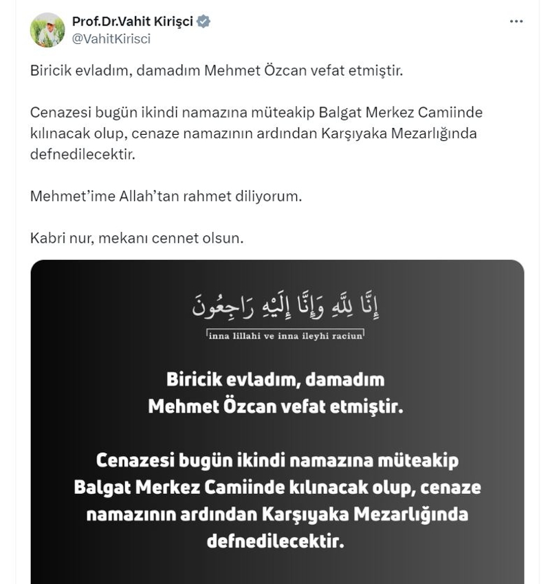 Vahit Kirişci, sosyal medya hesabından taziye mesajı yayımladı. Kirişci, "Biricik evladım, damadım Mehmet Özcan vefat etmiştir. Cenazesi bugün ikindi namazına müteakip Balgat Merkez Camisi'nde kılınacak olup, cenaze namazının ardından Karşıyaka Mezarlığı'nda defnedilecektir. Mehmet'ime Allah'tan rahmet diliyorum. Kabri nur, mekanı cennet olsun" dedi.