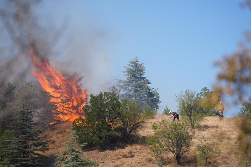 Arazinin dağlık olması nedeniyle yangın söndürme çalışması güçlükle sürdürülüyor.