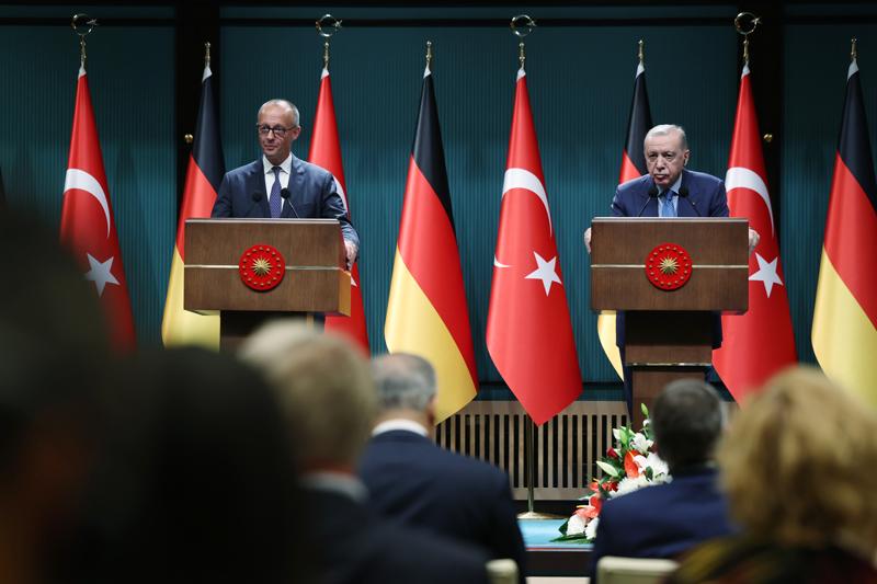 Erdoğan, Cumhurbaşkanlığı Külliyesi'nde, baş başa ve heyetler arası görüşme sonrasında Almanya Başbakanı Friedrich Merz ile ortak basın toplantısı düzenledi.