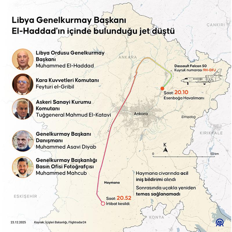 SORUŞTURMA BAŞLATILDIAdalet Bakanı Yılmaz Tunç, NSosyal hesabından yaptığı açıklamada, şunları kaydetti: Ankara Esenboğa Havalimanı'ndan havalanan, Libya Genelkurmay Başkanı Orgeneral Sayın Muhammed Ali Al-Haddad'ın da aralarında bulunduğu yolcuları taşıyan uçağın Haymana ilçesinde düşmesiyle ilgili Ankara Cumhuriyet Başsavcılığı tarafından soruşturma başlatılmıştır. Soruşturma kapsamında 1 Cumhuriyet başsavcıvekili koordinesinde 4 Cumhuriyet savcısı görevlendirilmiştir. Soruşturma tüm yönleriyle ve titizlikle yürütülmektedir.